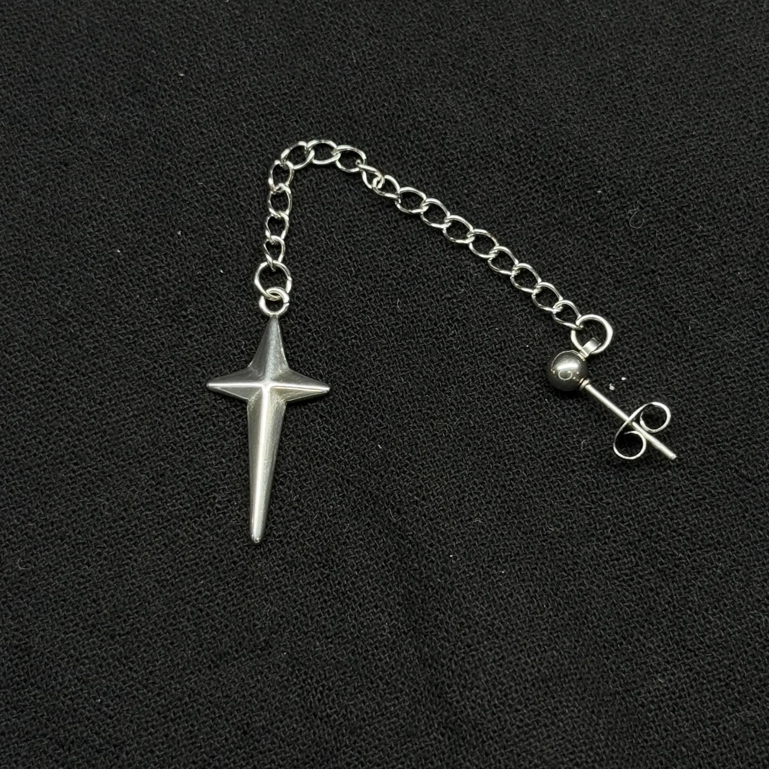 Cuenta con una cadena delicada que conecta el perno clásico con un dije en forma de cruz estilizada y alargada, ideal para darle un toque distintivo a tu outfit.