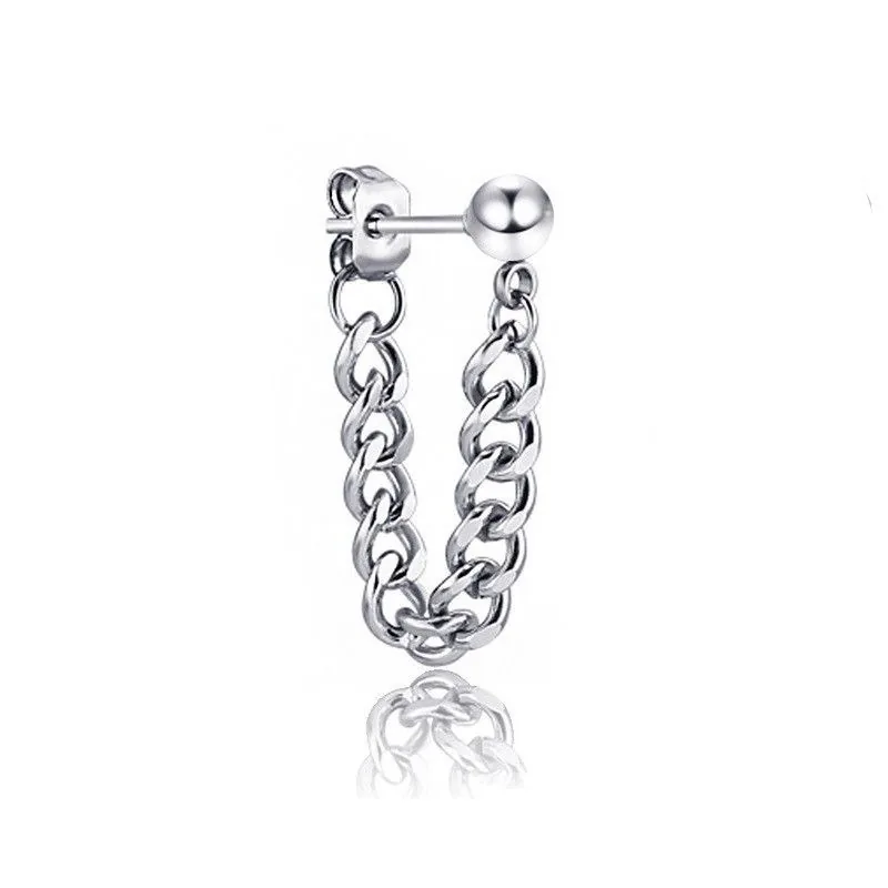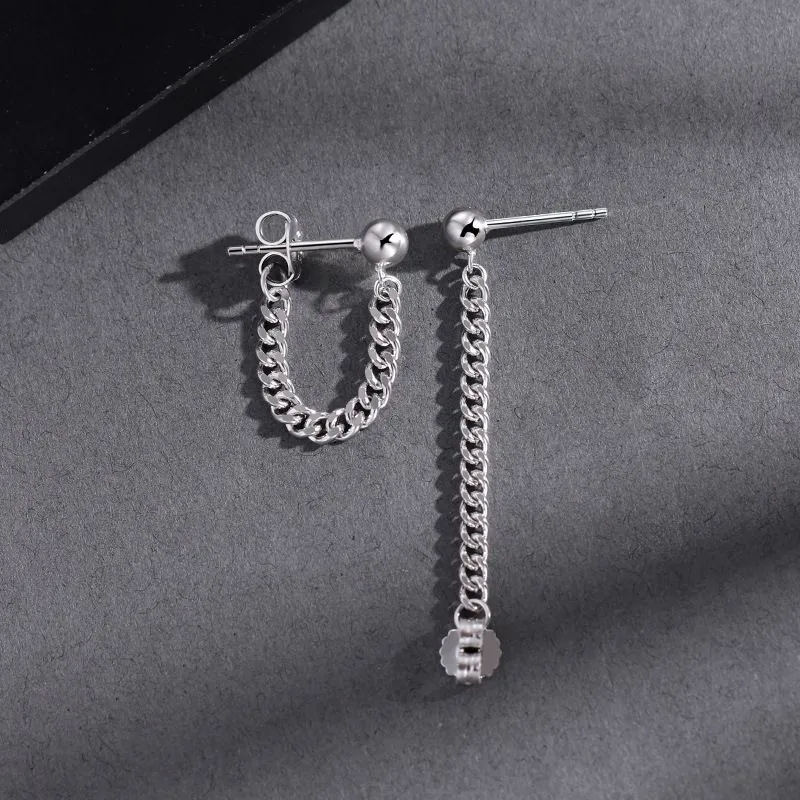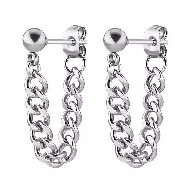 Par de aros tipo stud (botón) con cadena doble: un lado más corto tipo “U” y otro colgante más largo, para un look punk/urbano bien marcado. Son livianos, cómodos y quedan tremendo tanto solos como combinados con otros piercings o aros.