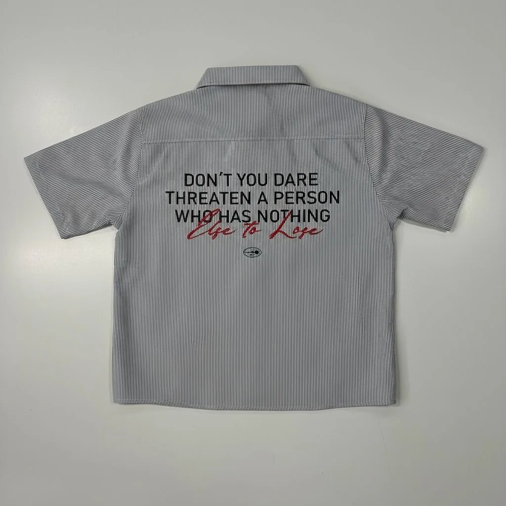 “DON’T YOU DARE THREATEN A PERSON WHO HAS NOTHING ELSE TO LOSE” en negro y rojo.