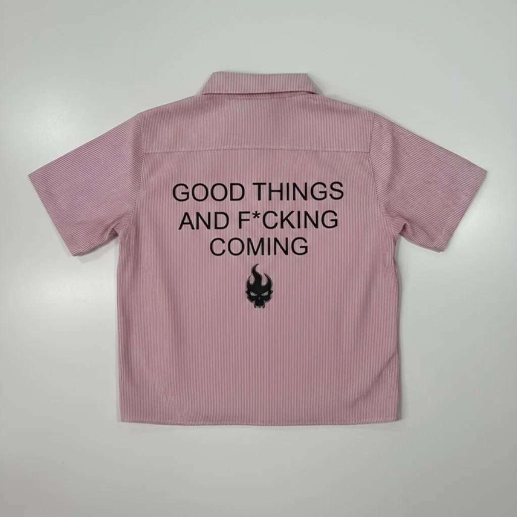 “GOOD THINGS AND F*CKING COMING” junto al ícono de calavera.