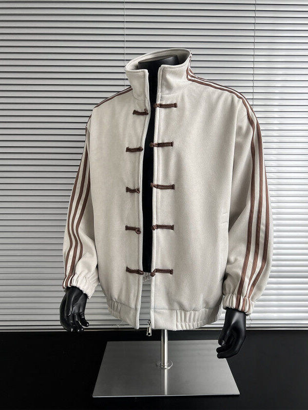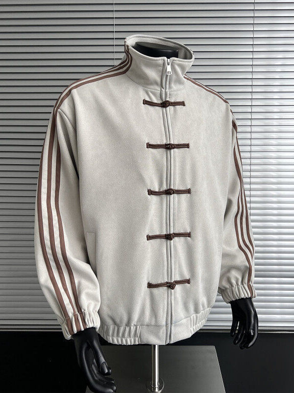 Campera gamuzada estilo oriental, con cierres tipo alamar (nudos chinos) al frente y cierre para mayor practicidad. Está forrada por dentro, ideal para media estación y días frescos, y suma un bolsillo interno para guardar celular, billetera o llaves con seguridad.