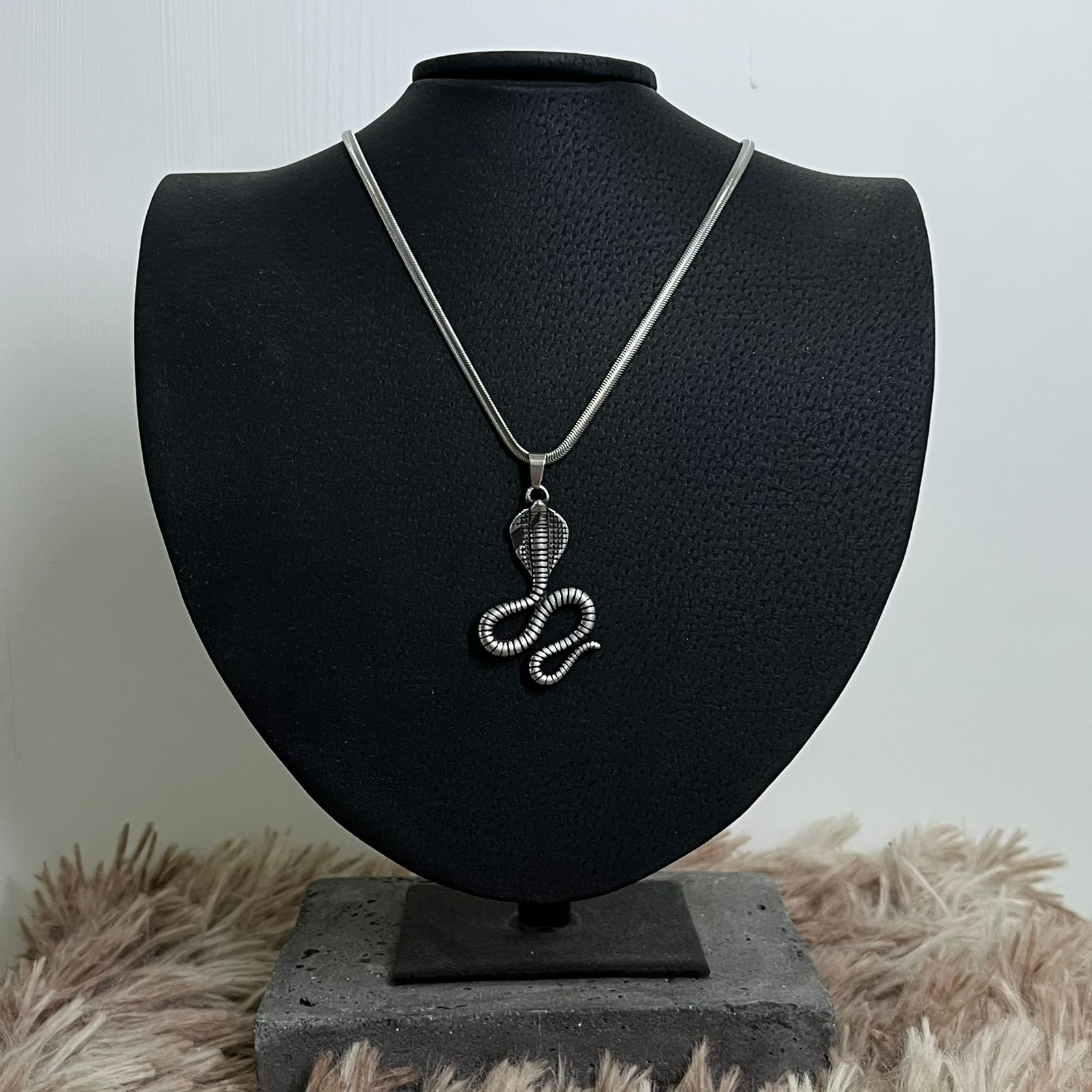 Collar de acero con dije de cobra en relieve, ideal para darle un toque más oscuro y llamativo a cualquier outfit.