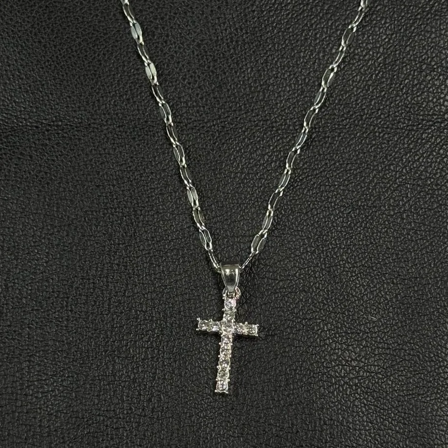 Collar con dije de cruz incrustada en pequeñas piedras brillantes.