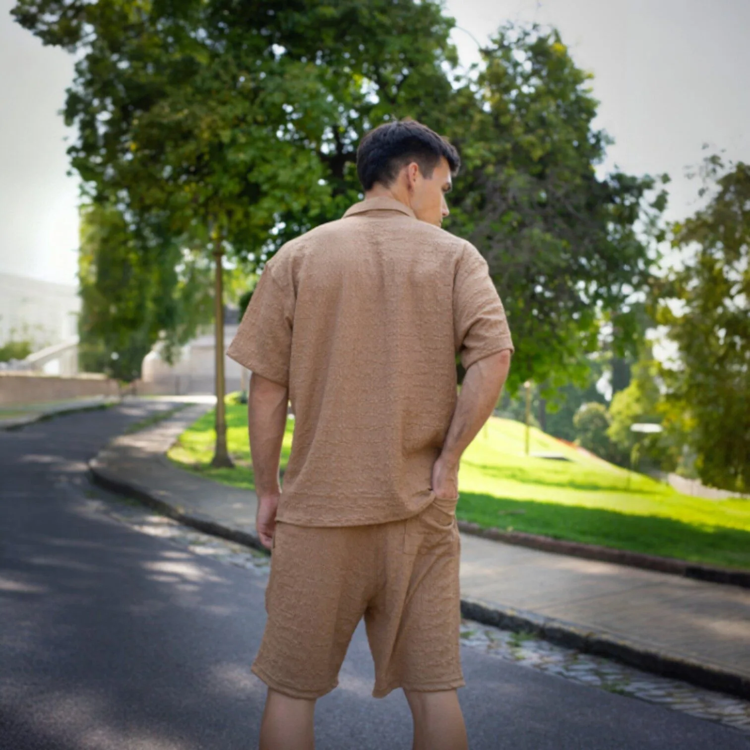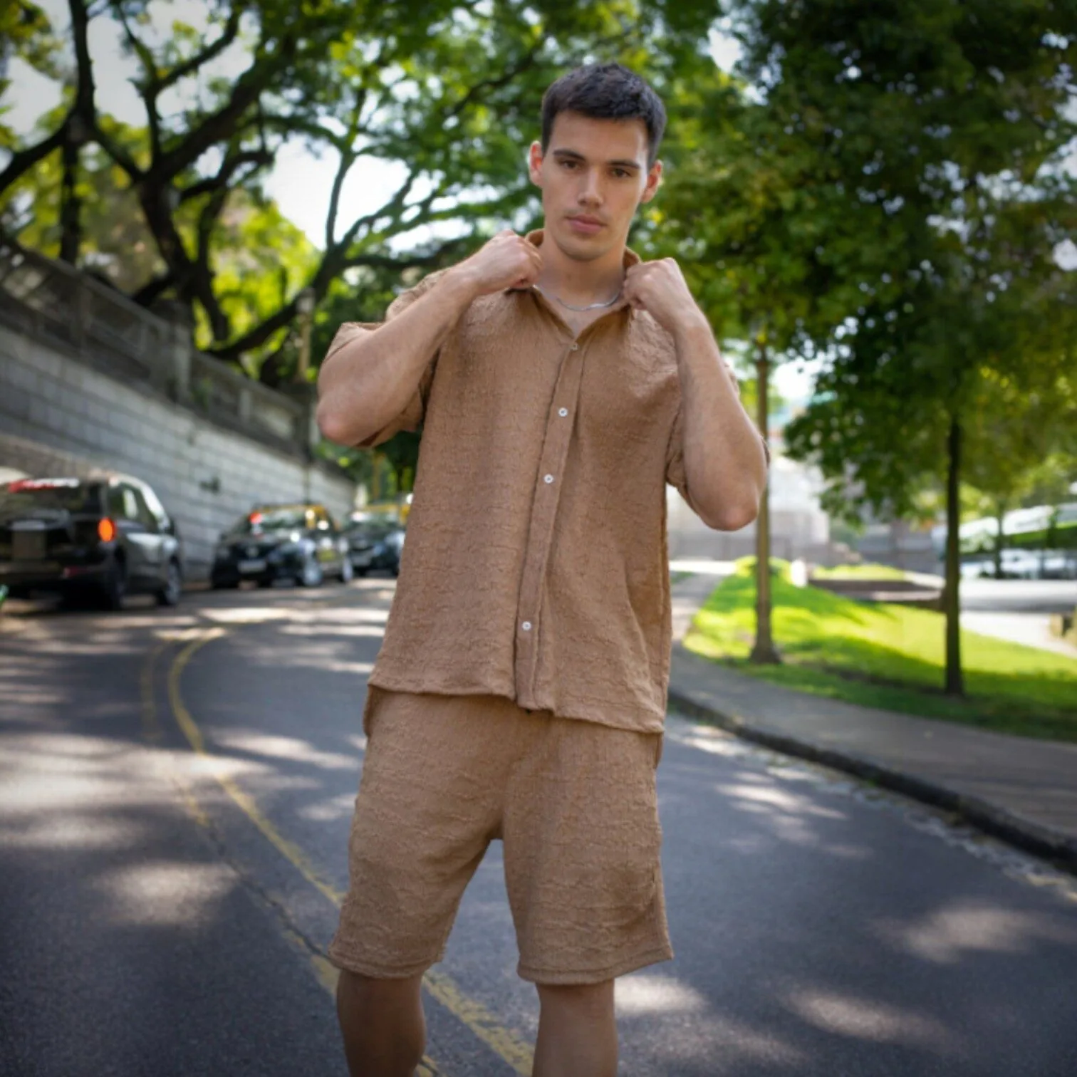 Conjunto de 2 piezas confeccionado en tela crepé arrugada, liviana y suave al tacto en color tostado: camisa manga corta con botones + short a juego. Elegante y urbano, con textura protagonista.