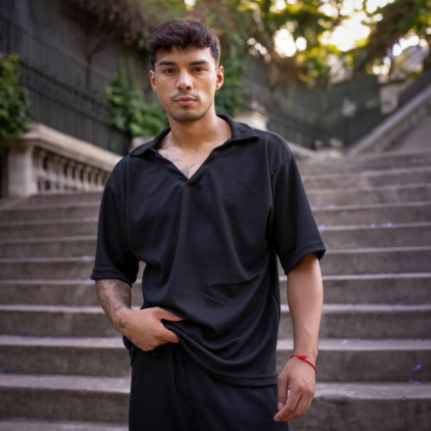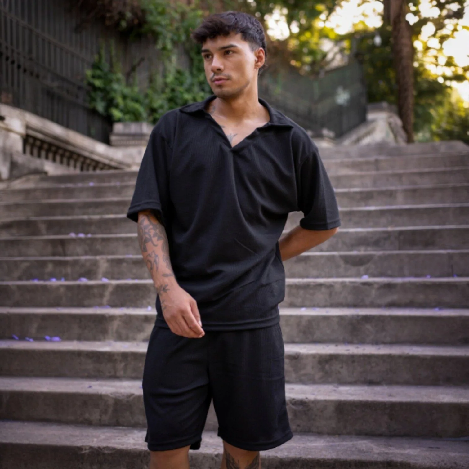 Conjunto de 2 piezas en algodón waffle color negro: Chomba manga corta con cuello y escote abierto + short a juego. Minimalista, canchero y cómodo.