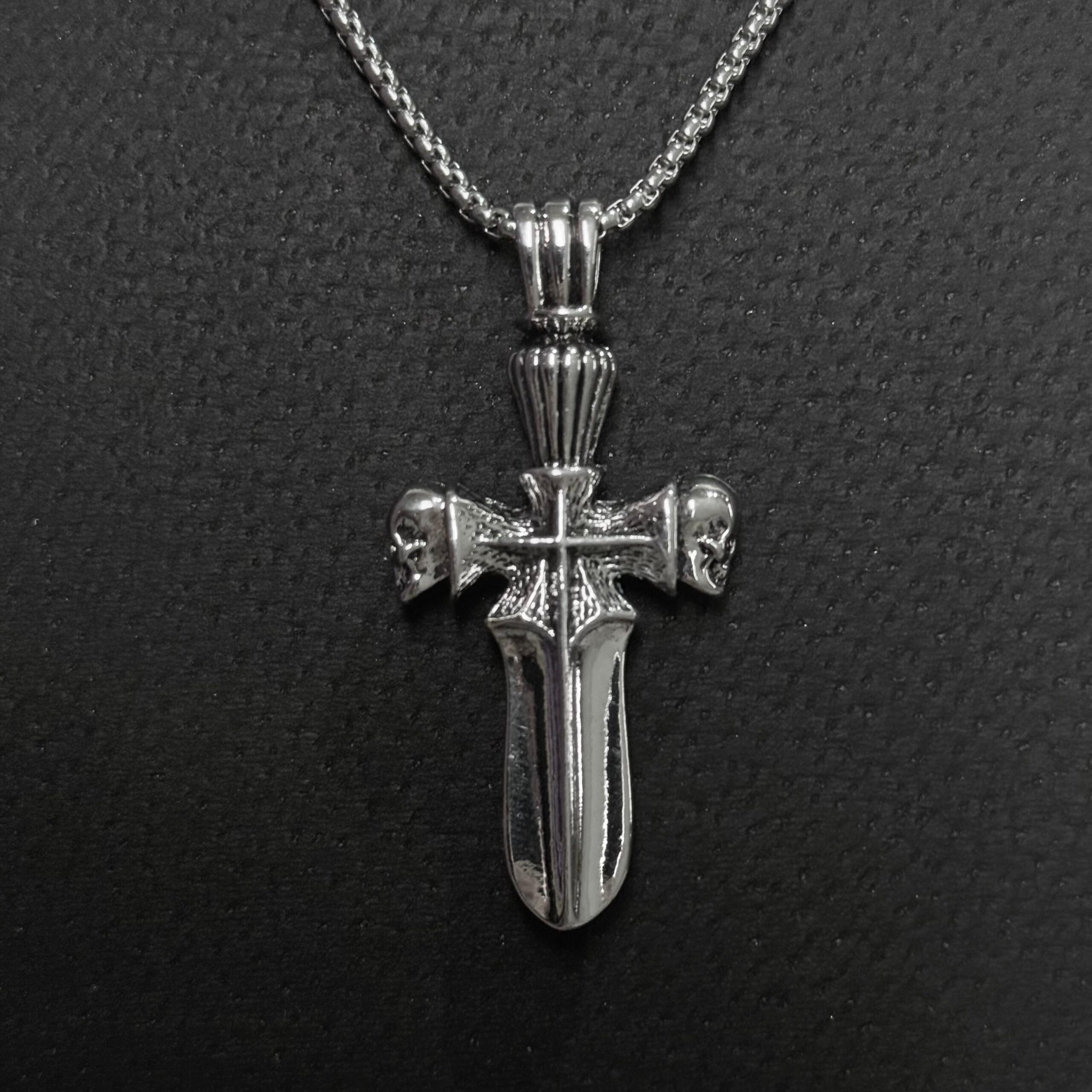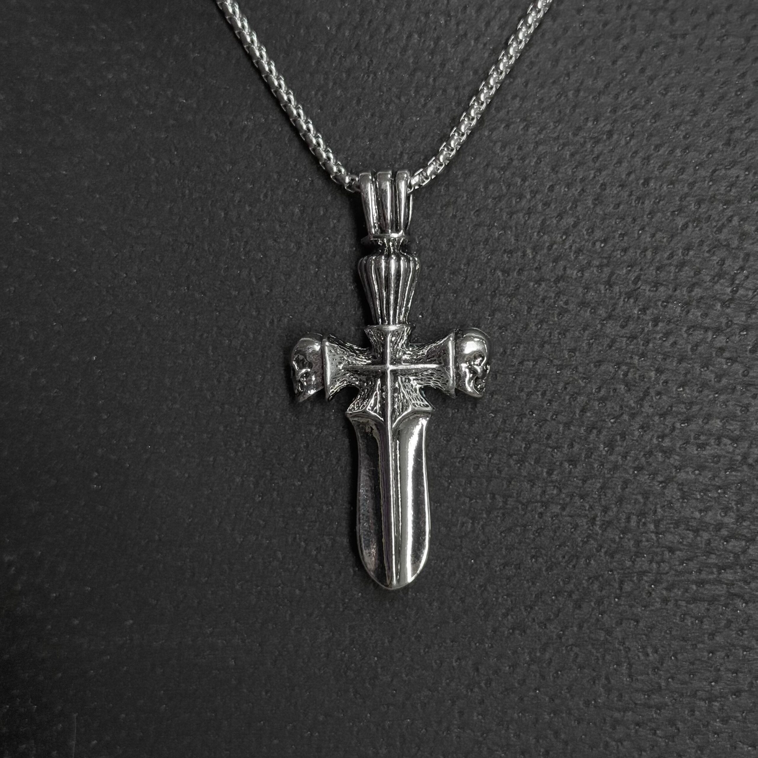 Collar con dije tipo espada en forma de cruz, con estética gótica/rockera y detalles bien marcados. En la parte superior lleva una cruz central y, en los extremos, dos calaveras en relieve que le dan ese look oscuro y pesado. La terminación es metal pulido con texturas en el centro para resaltar el diseño.