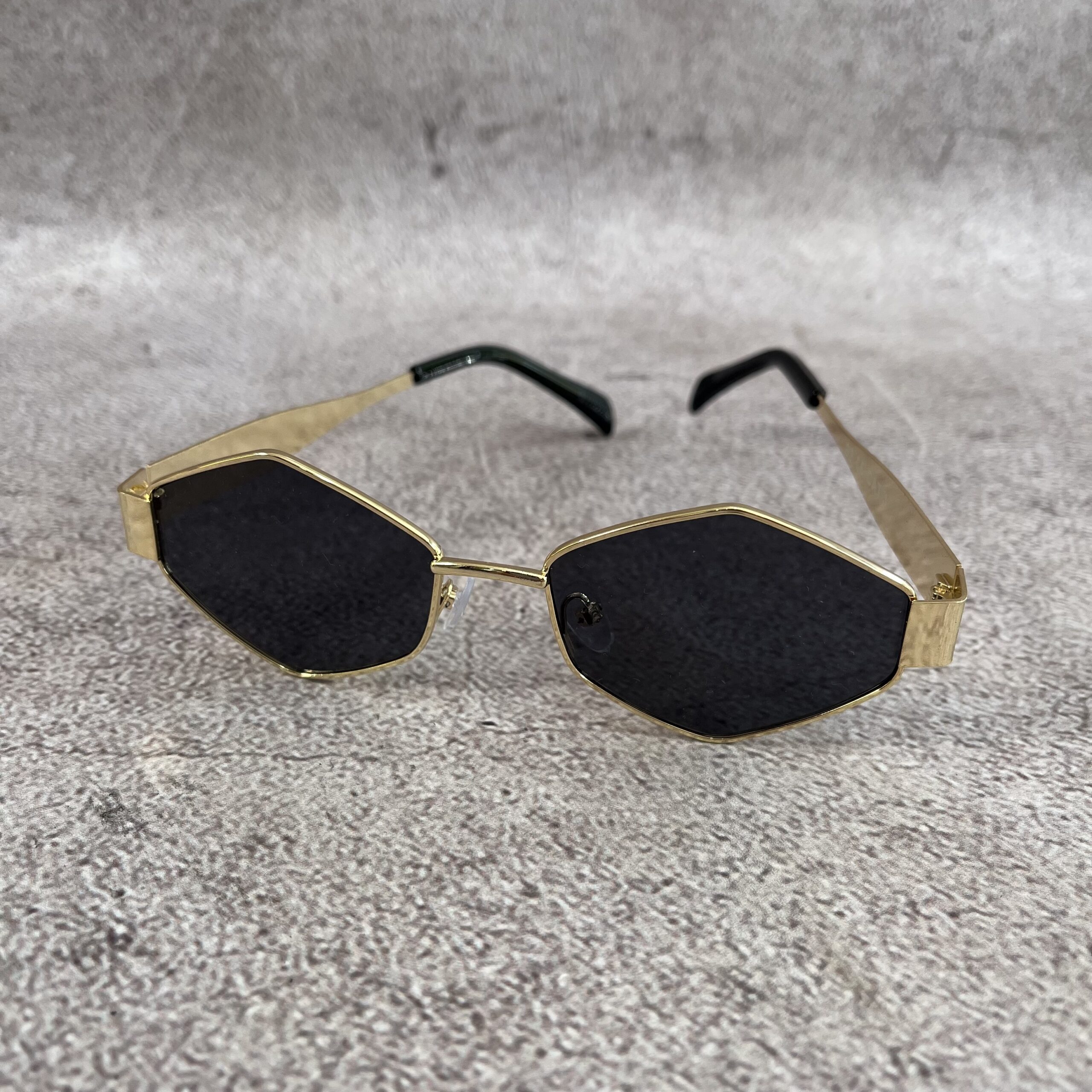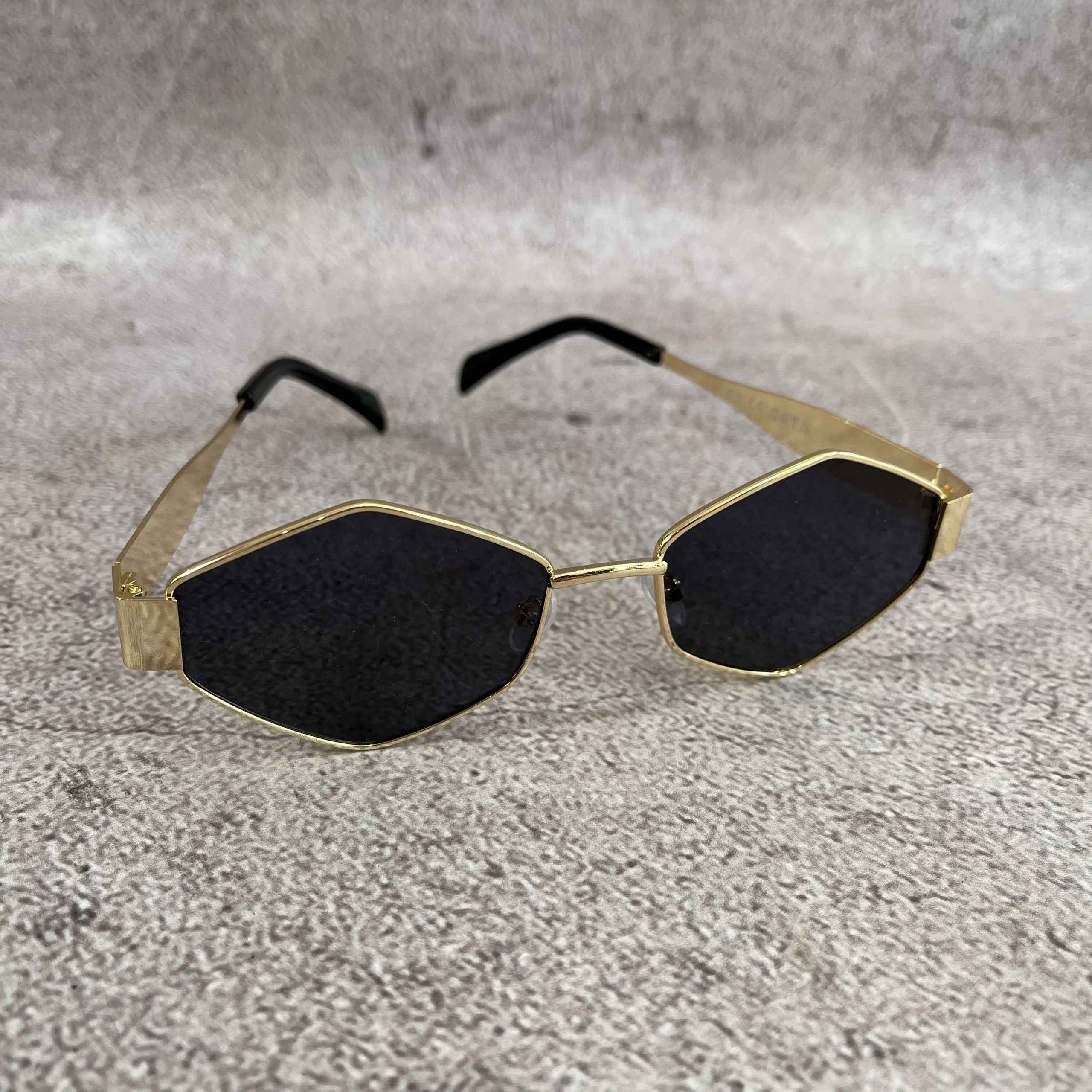 Un diseño distinto y con mucha presencia: las gafas Polygon Retro Gold Black combinan un armazón metálico dorado con lentes negras en forma poligonal, logrando un estilo moderno y elegante a la vez.
