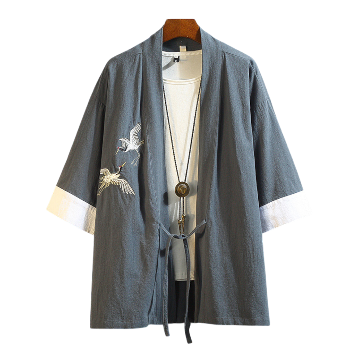 Haori unisex de lino con textura suave y bordado de grullas (tsuru) en el frente. Diseño minimal y elegante, con puños en contraste y lazo frontal para ajustar. Ideal para un look relajado pero prolijo (remera lisa + pantalón recto/cargo).