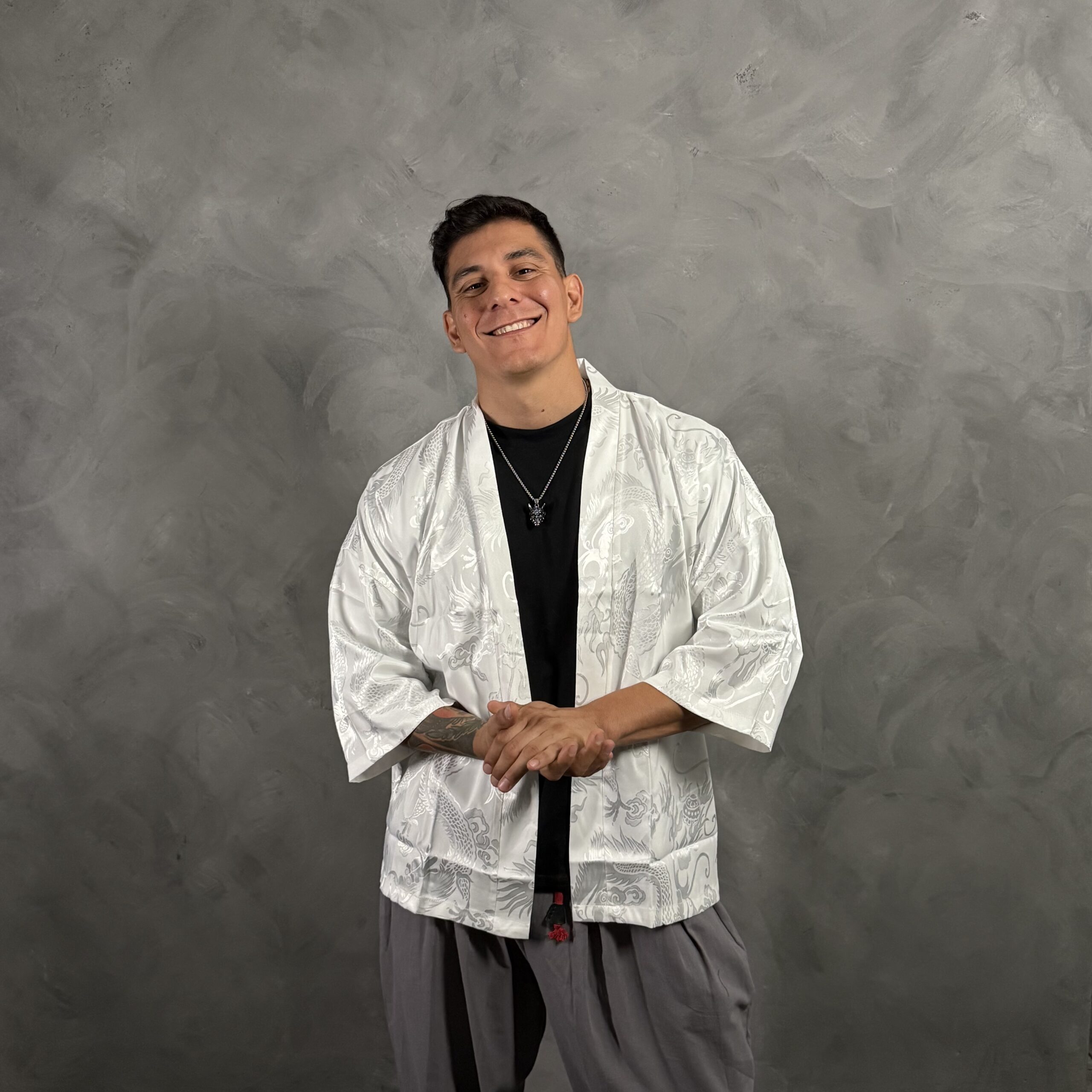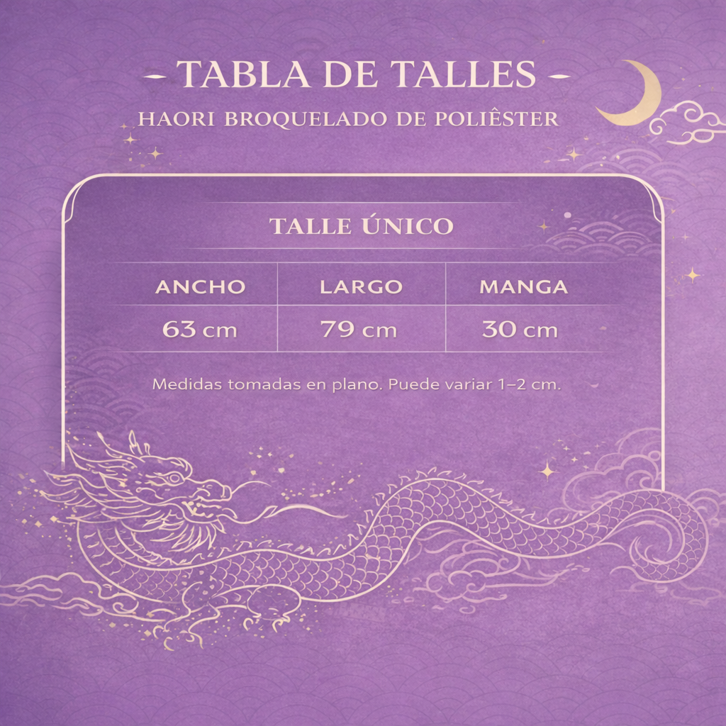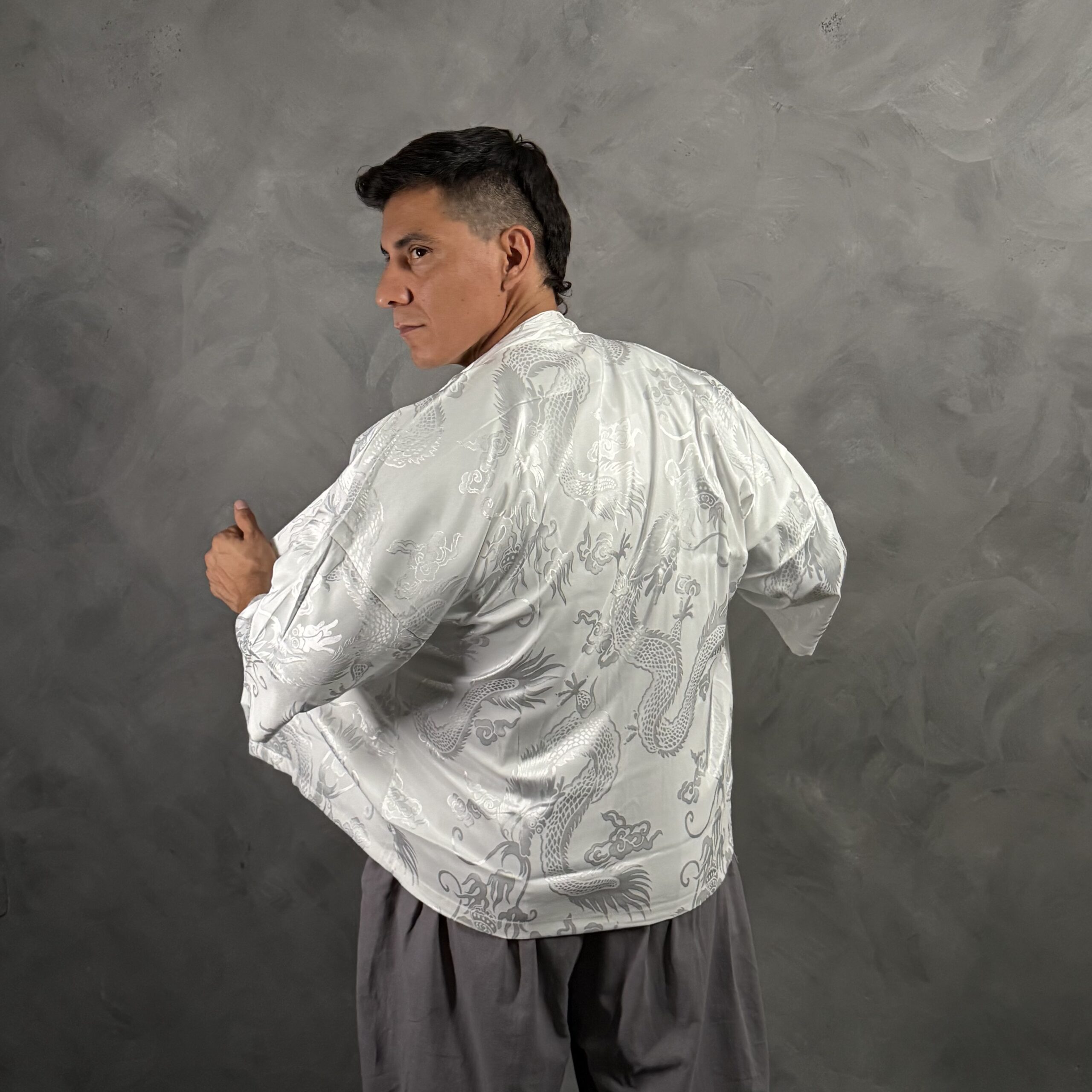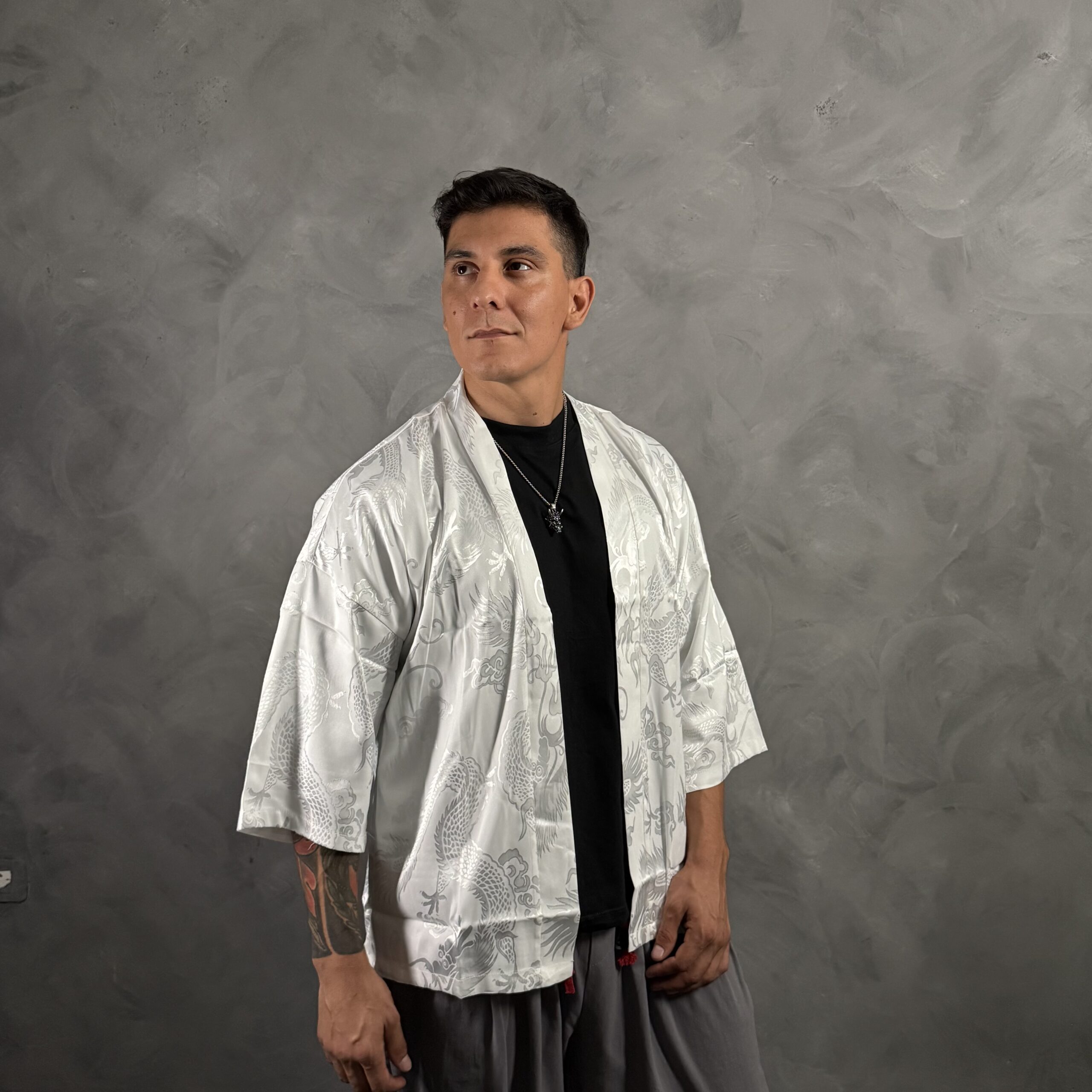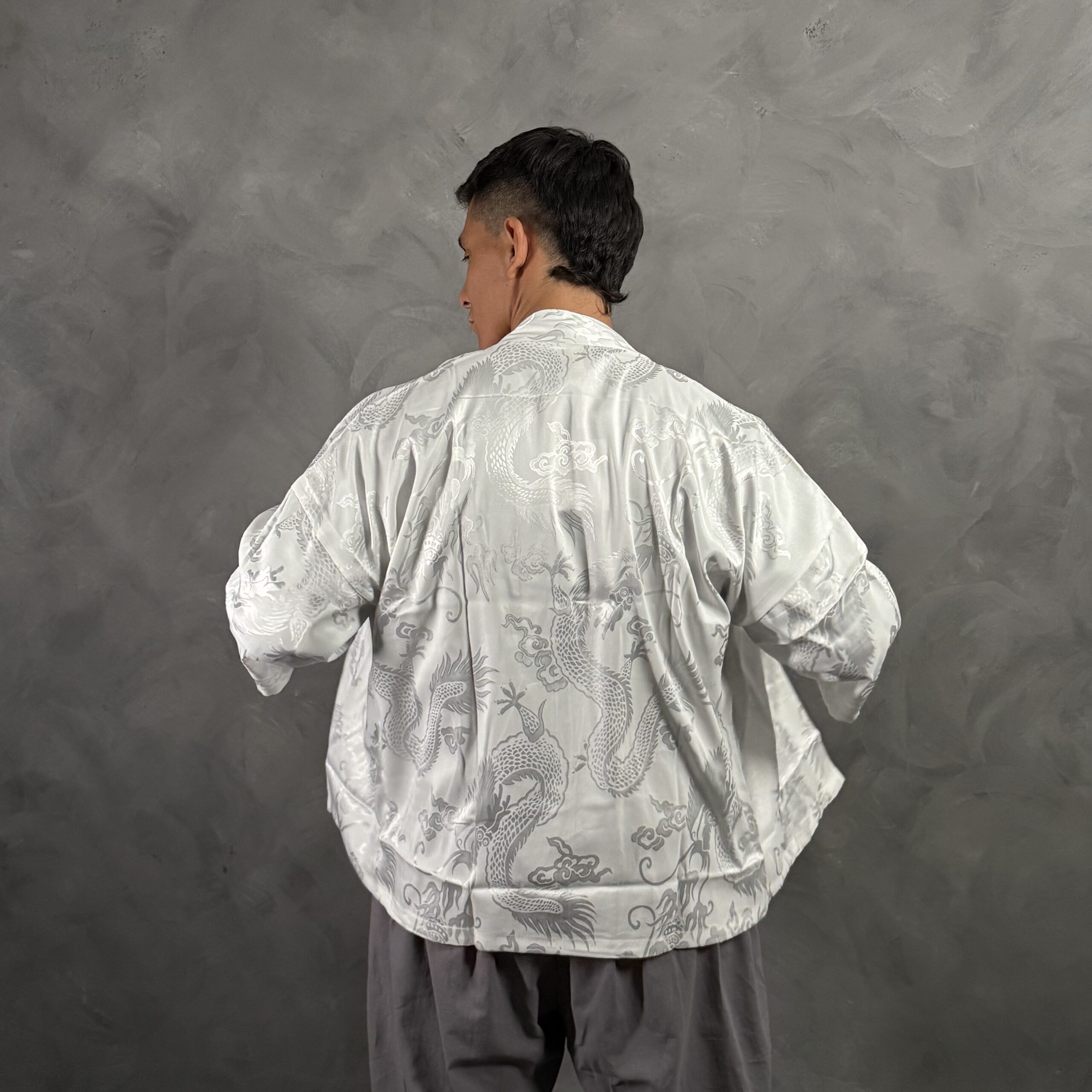 Haori de poliéster blanco estilo broquelado, con dibujo de dragones en relieve tono sobre tono. Tela liviana y suave al tacto, corte amplio y cómodo, ideal para sumar un toque elegante y canchero a looks urbanos o de noche.