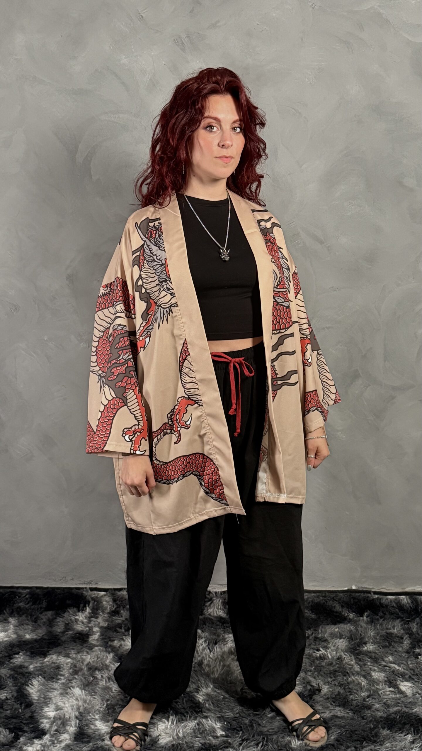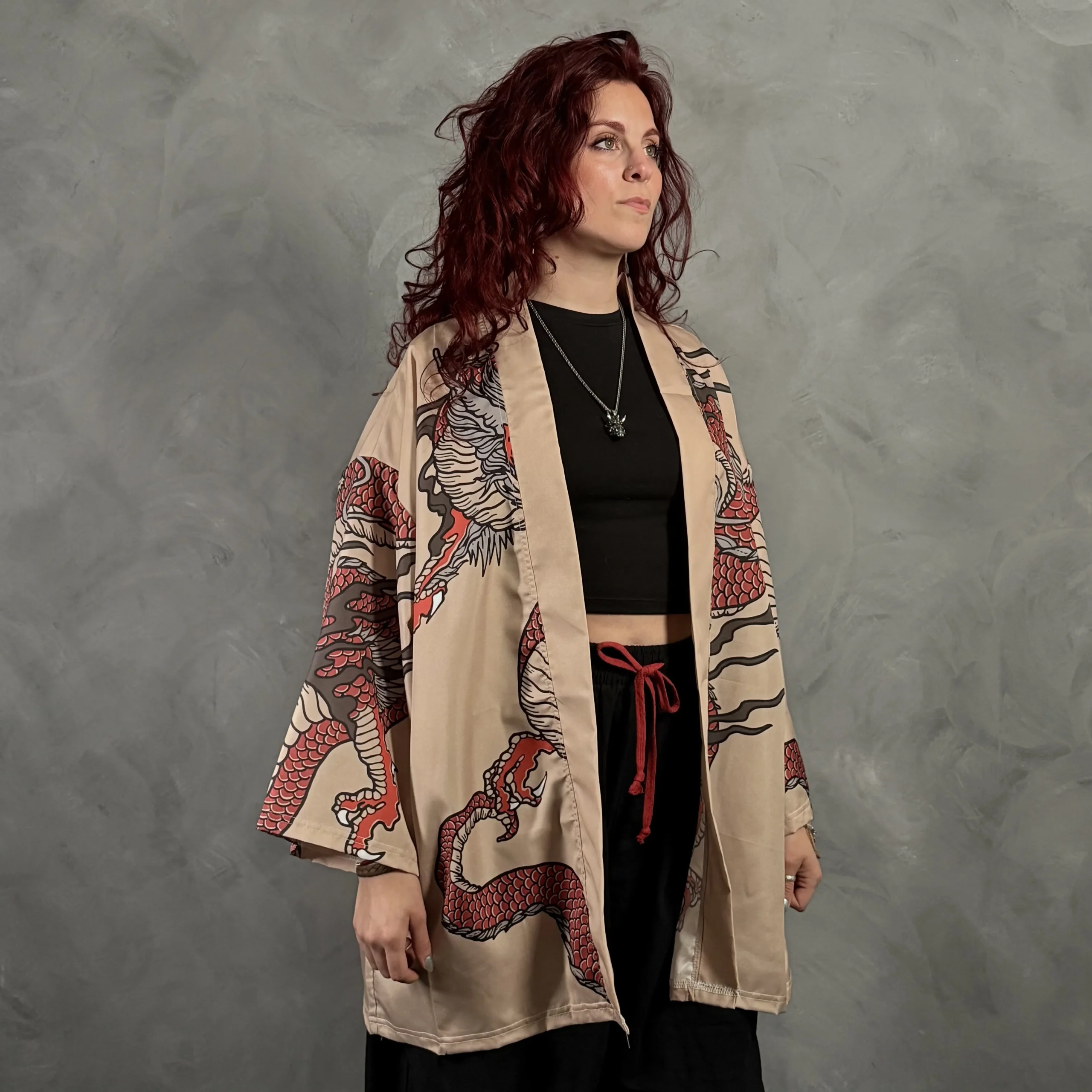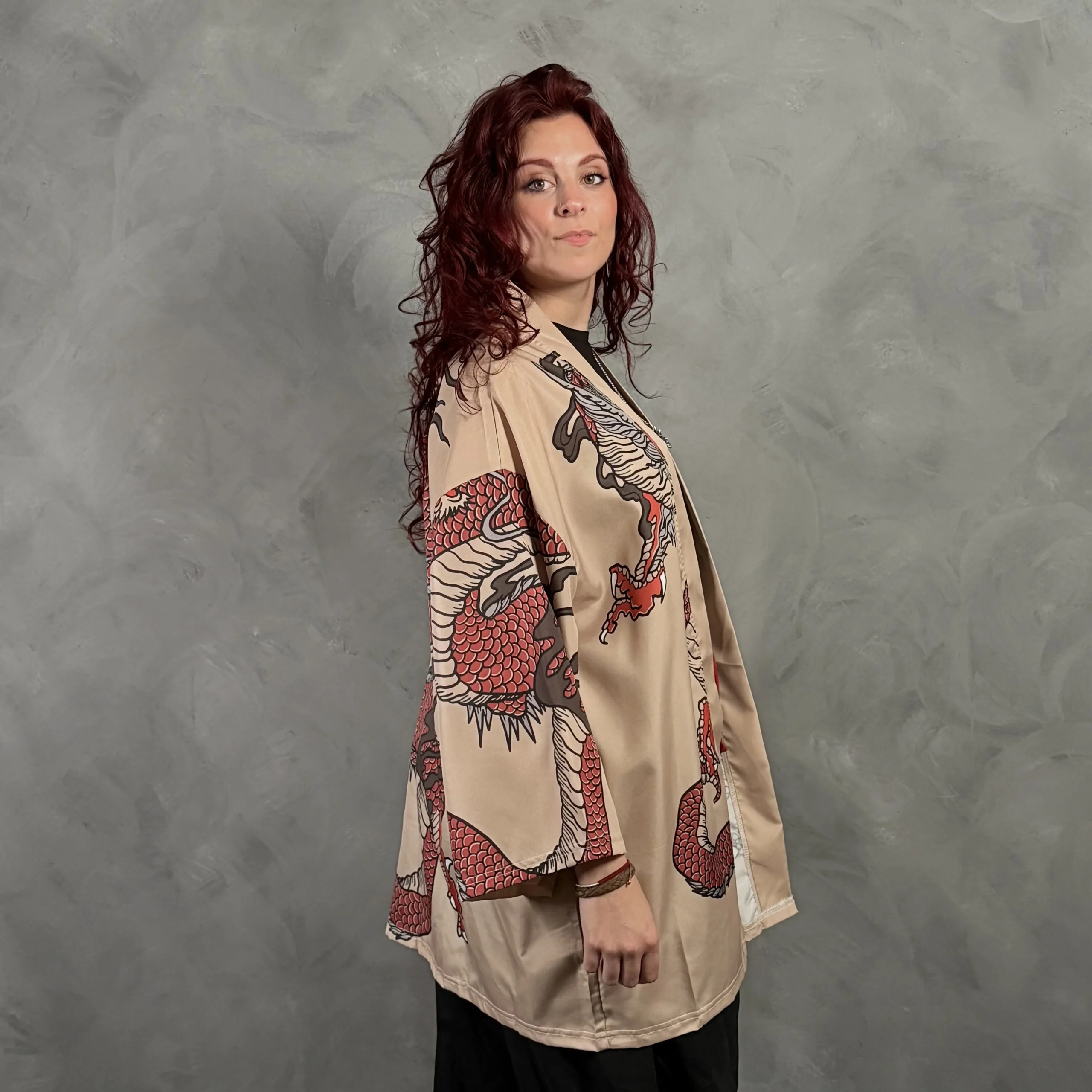 Haori unisex con estampa full print de drag贸n en tonos rojos estilo japones, pensado para quienes quieren un look protagonista.