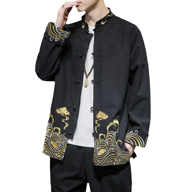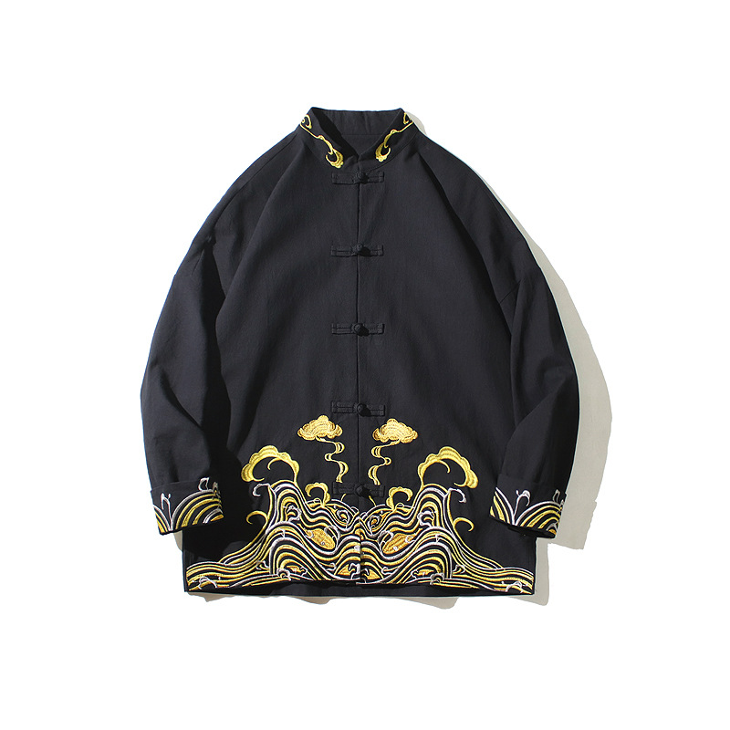 El Enkai Haori captura la esencia del océano en movimiento. Inspirado en las olas tradicionales del arte oriental, este diseño combina un fondo negro profundo con bordados en tonos dorados que representan fuerza, fluidez y control.
