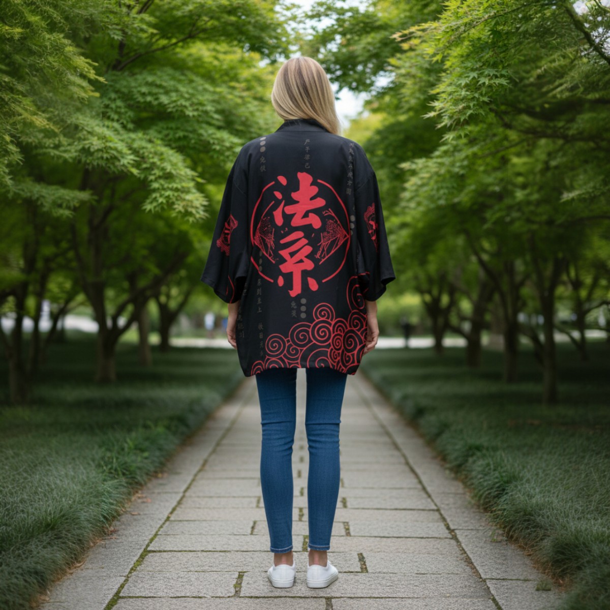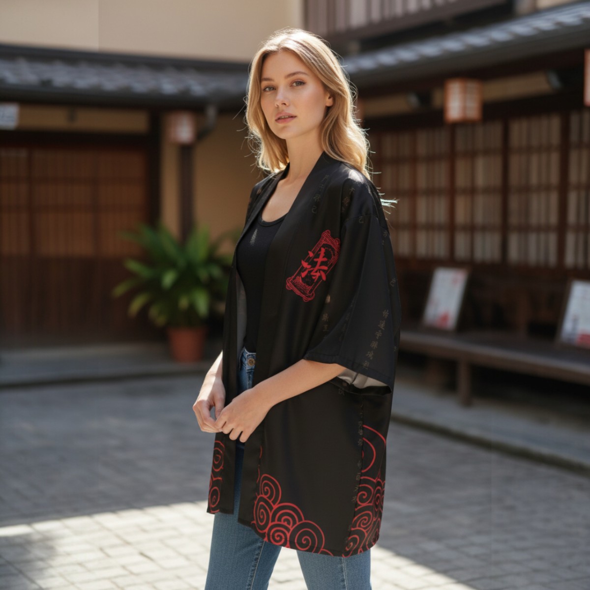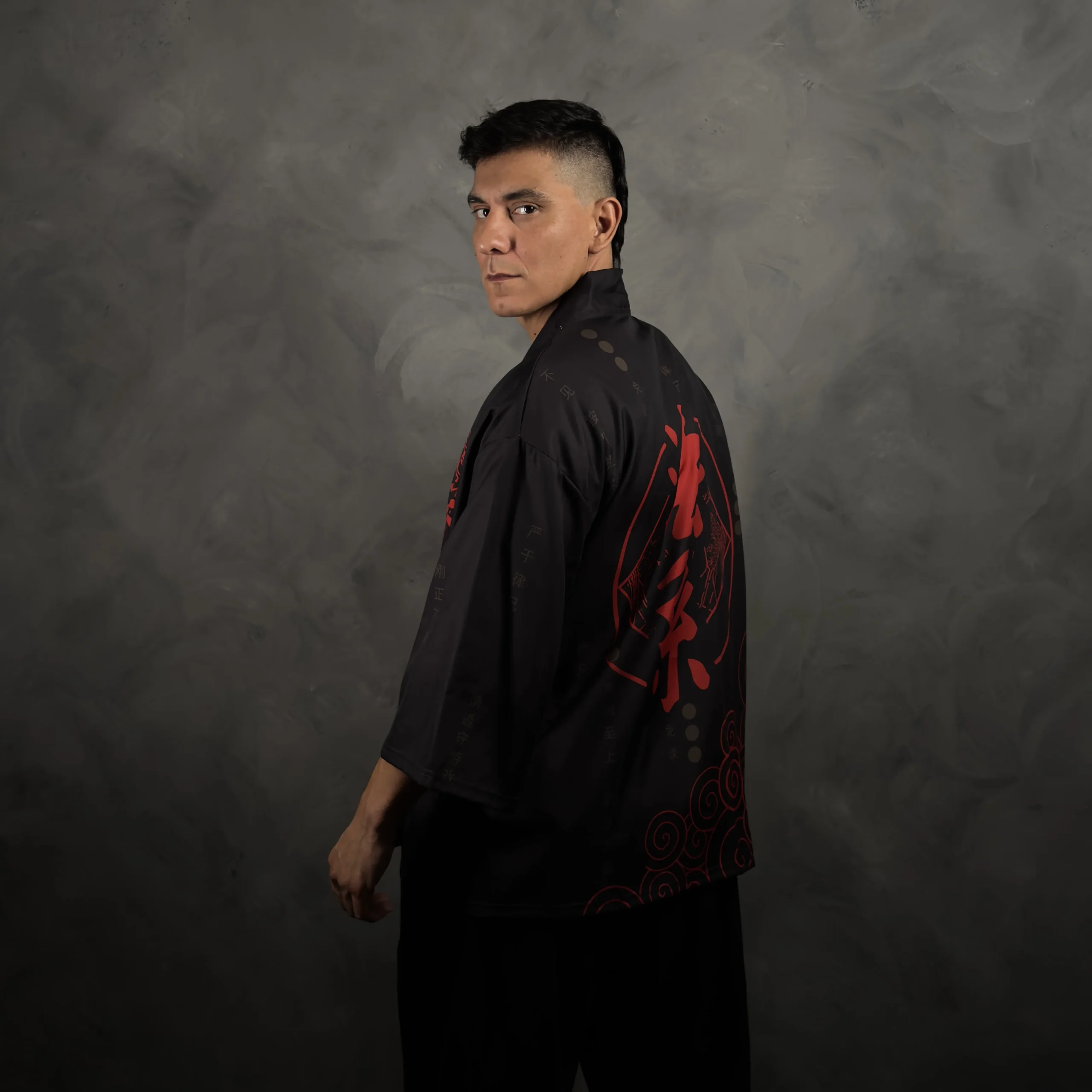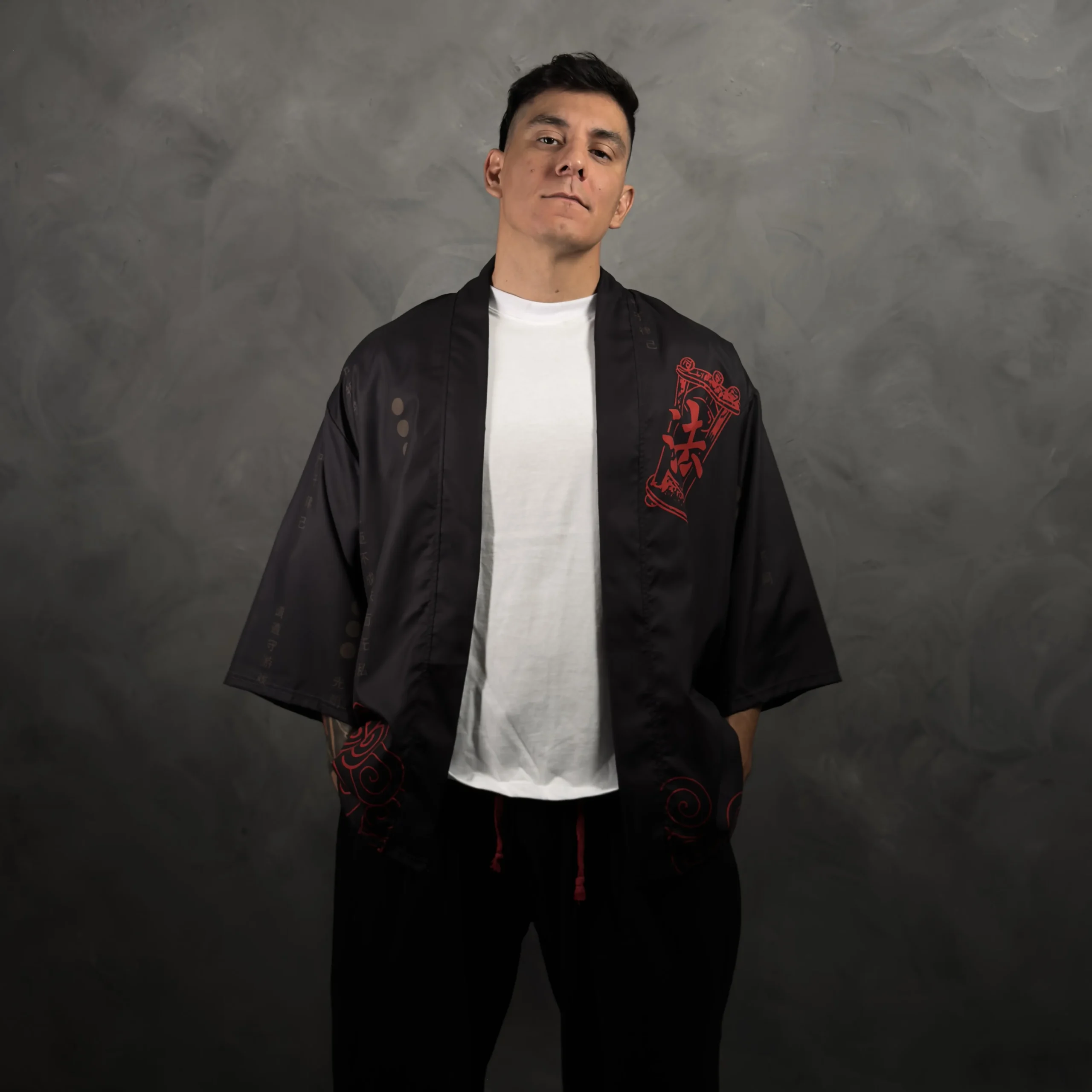 Haori de poliéster estilo japonés en negro con un diseño minimalista y oscuro, donde el protagonista es el kanji rojo XL “法家” en la espalda. Lleva detalles de escritura tonal (negro sobre negro) y un patrón de nubes rojas en espiral en la parte baja que suma estética sin recargar. Calce suelto tipo kimono, ideal para usar abierto arriba de remera, musculosa o buzo fino y levantar el outfit al toque.