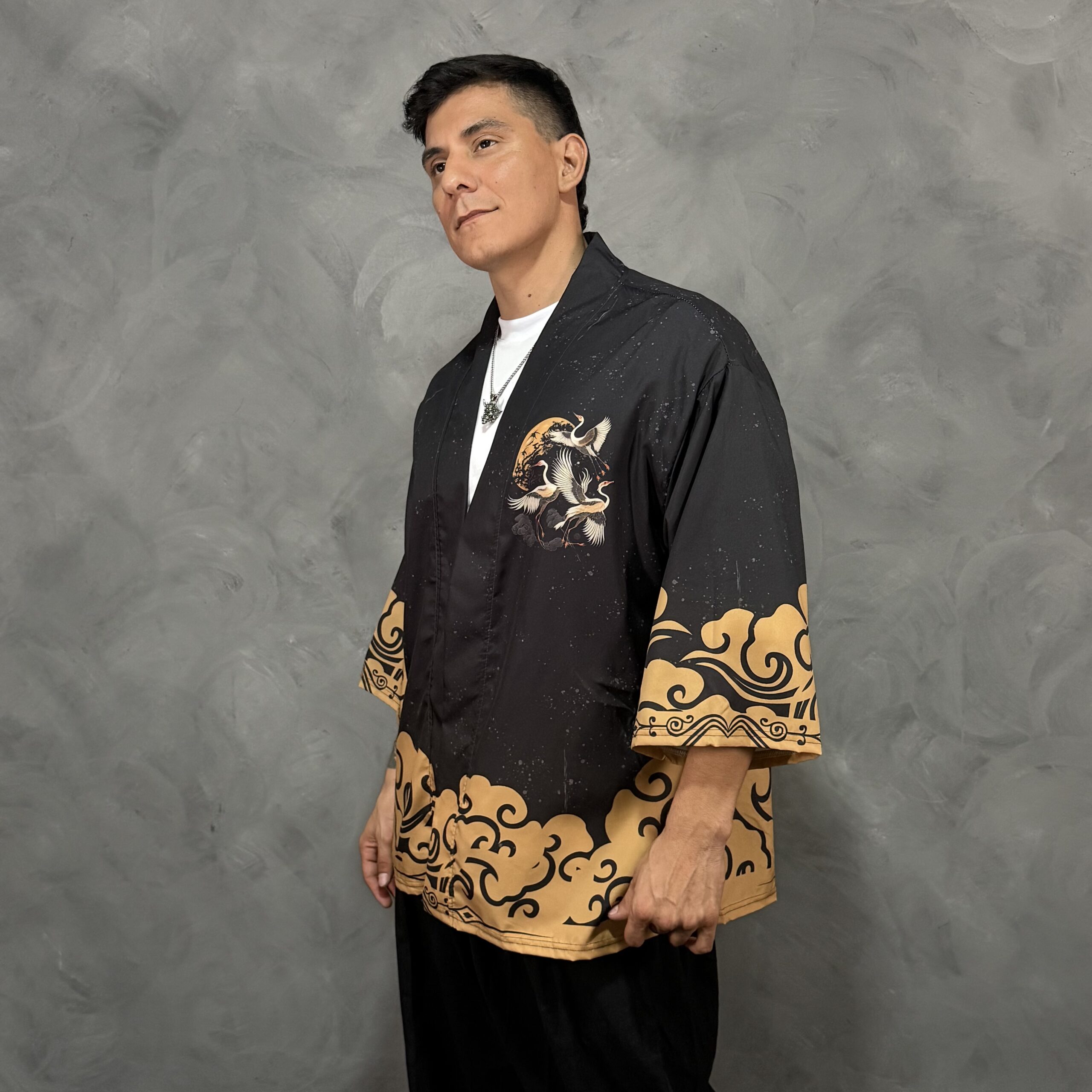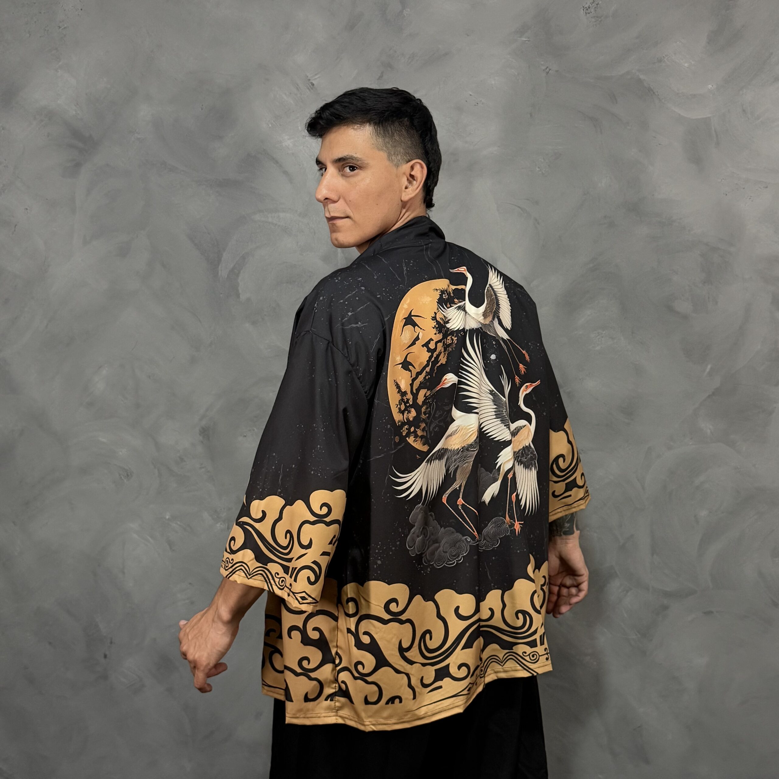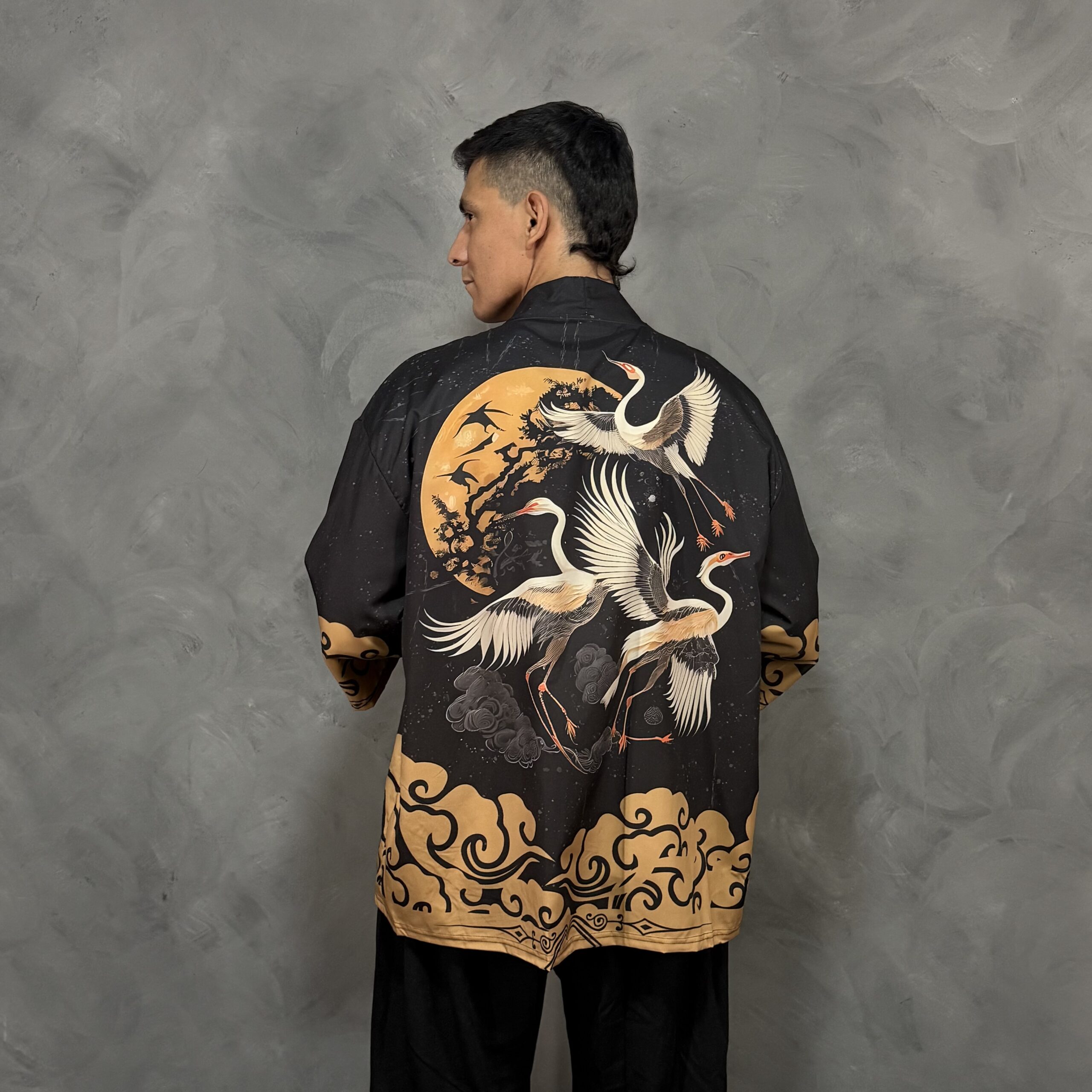 Haori unisex de poliéster con estampa protagonista: grullas en vuelo, luna dorada y nubes ornamentales en la parte trasera. Un diseño elegante con vibra japonesa tradicional, ideal para usar como capa arriba de una remera lisa.