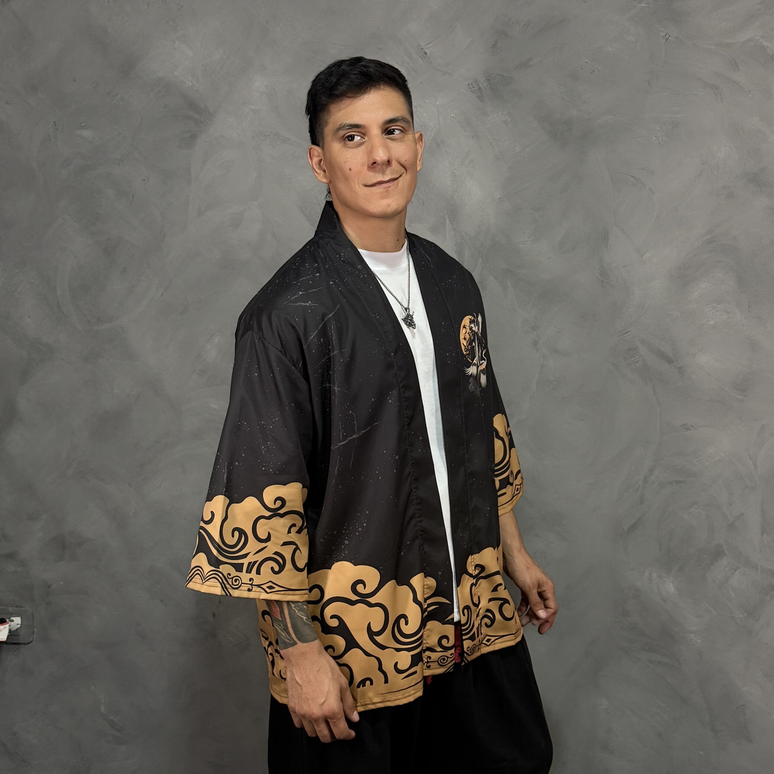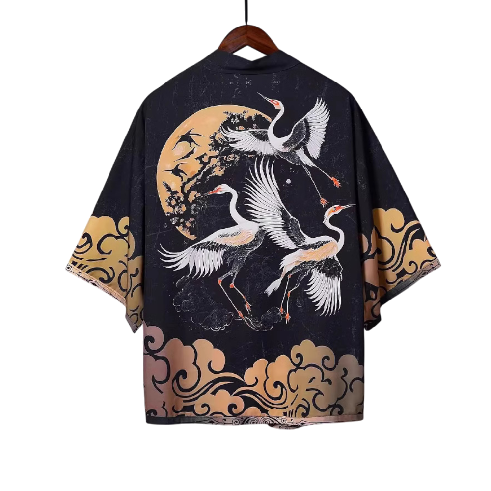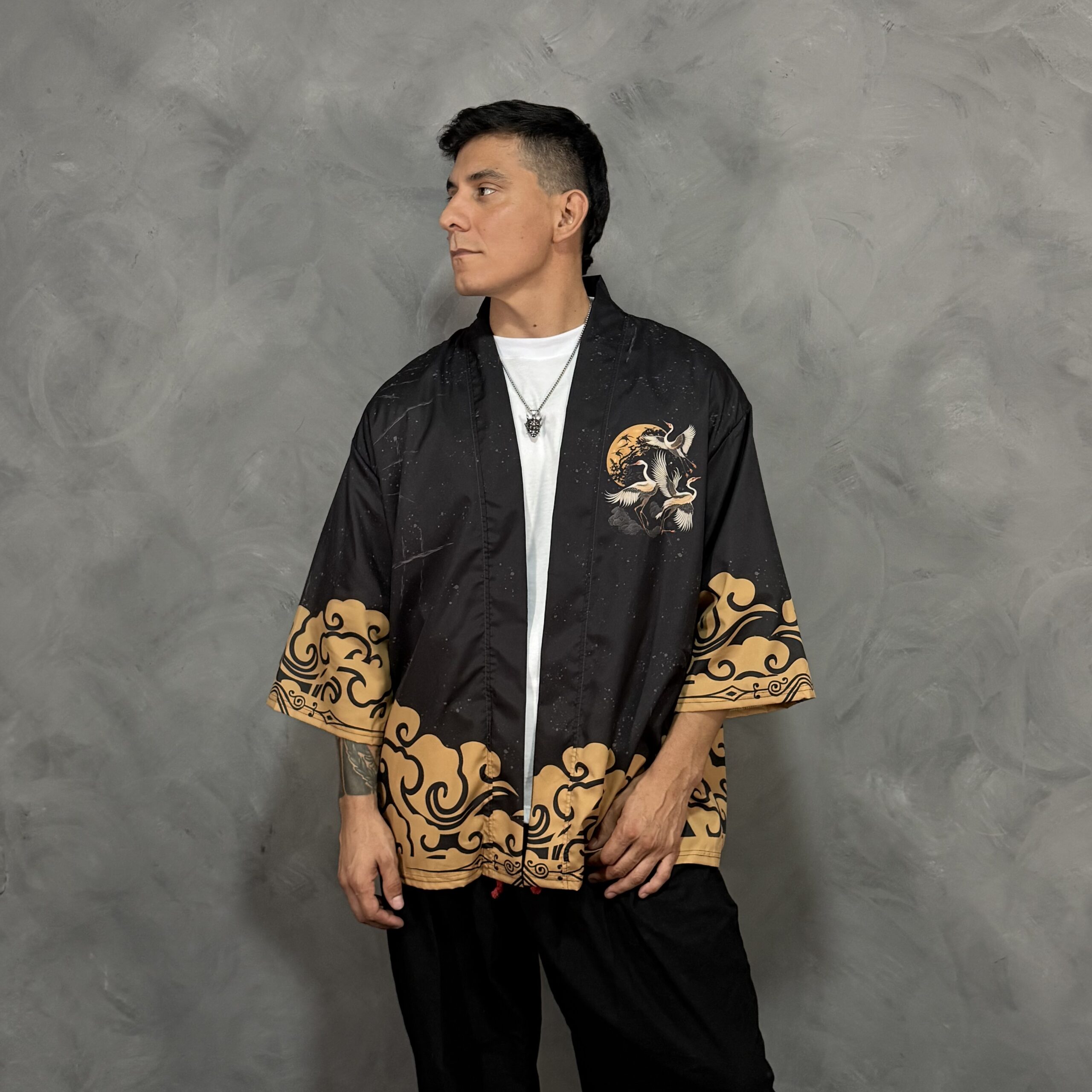 Haori unisex de poliéster con estampa protagonista: grullas en vuelo, luna dorada y nubes ornamentales en la parte trasera. Un diseño elegante con vibra japonesa tradicional, ideal para usar como capa arriba de una remera lisa.