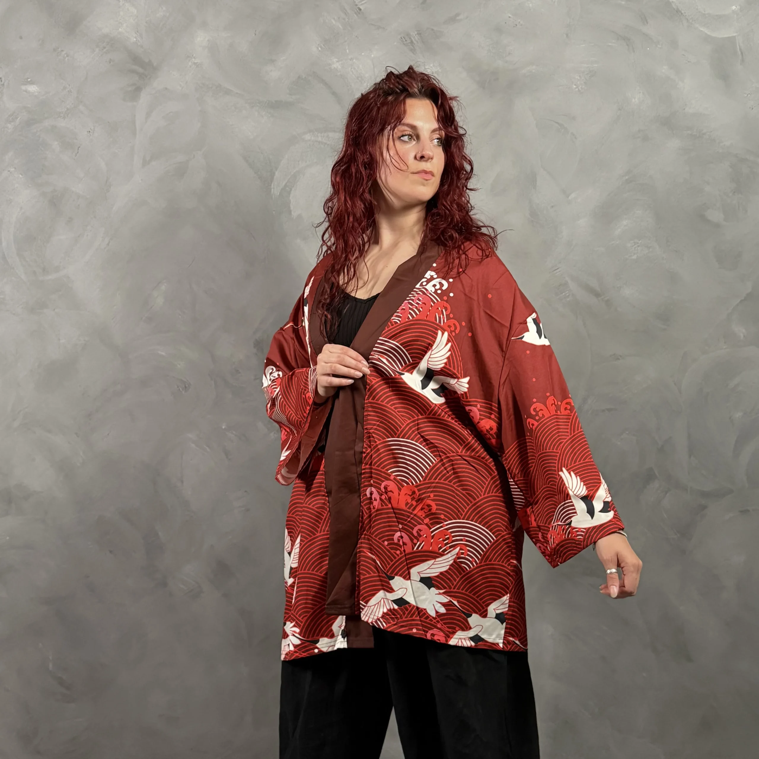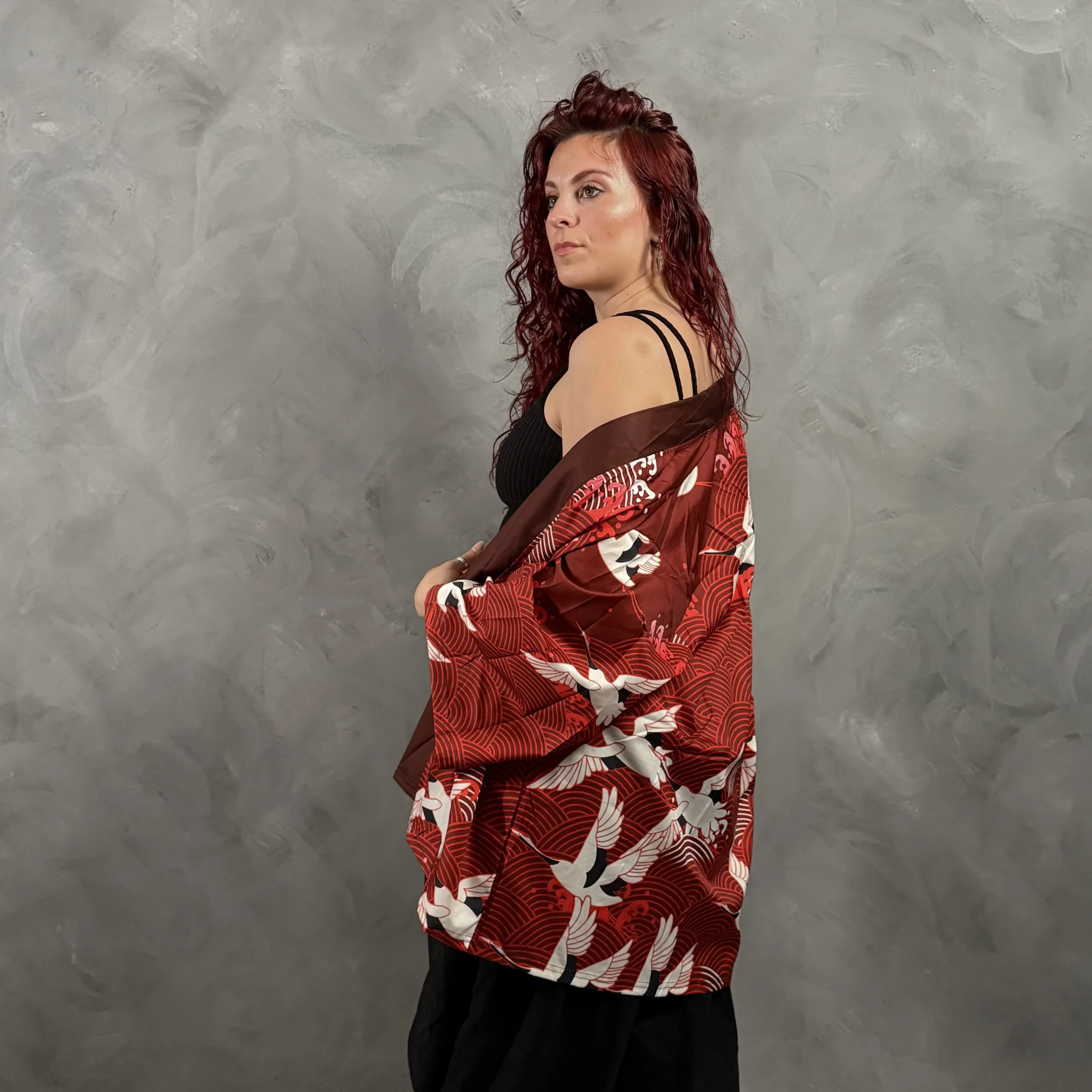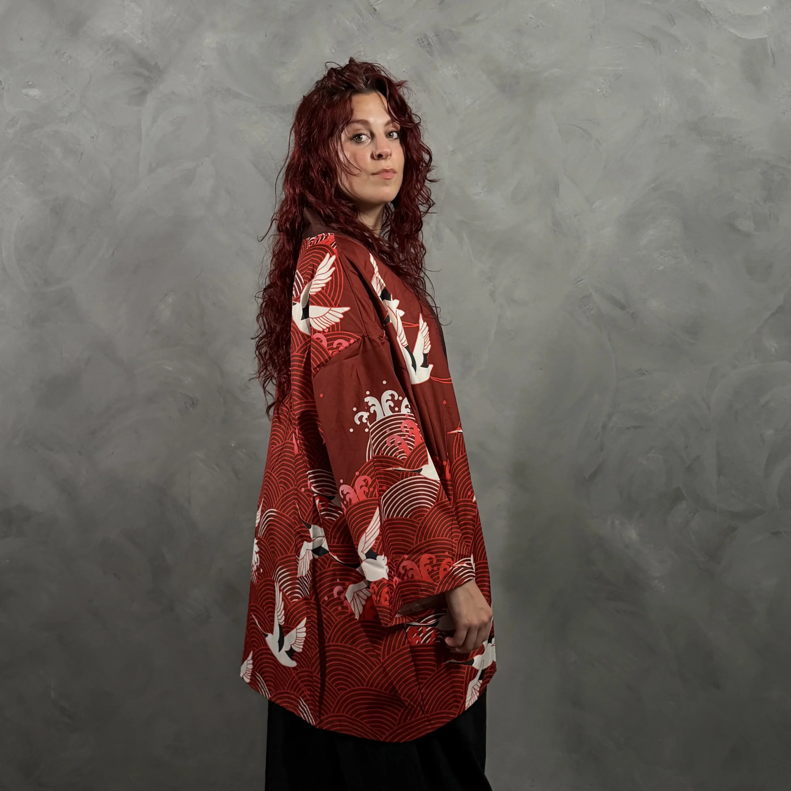 Haori oversize unisex en tono rojo carmesí con estampa de grullas blancas volando sobre olas japonesas.