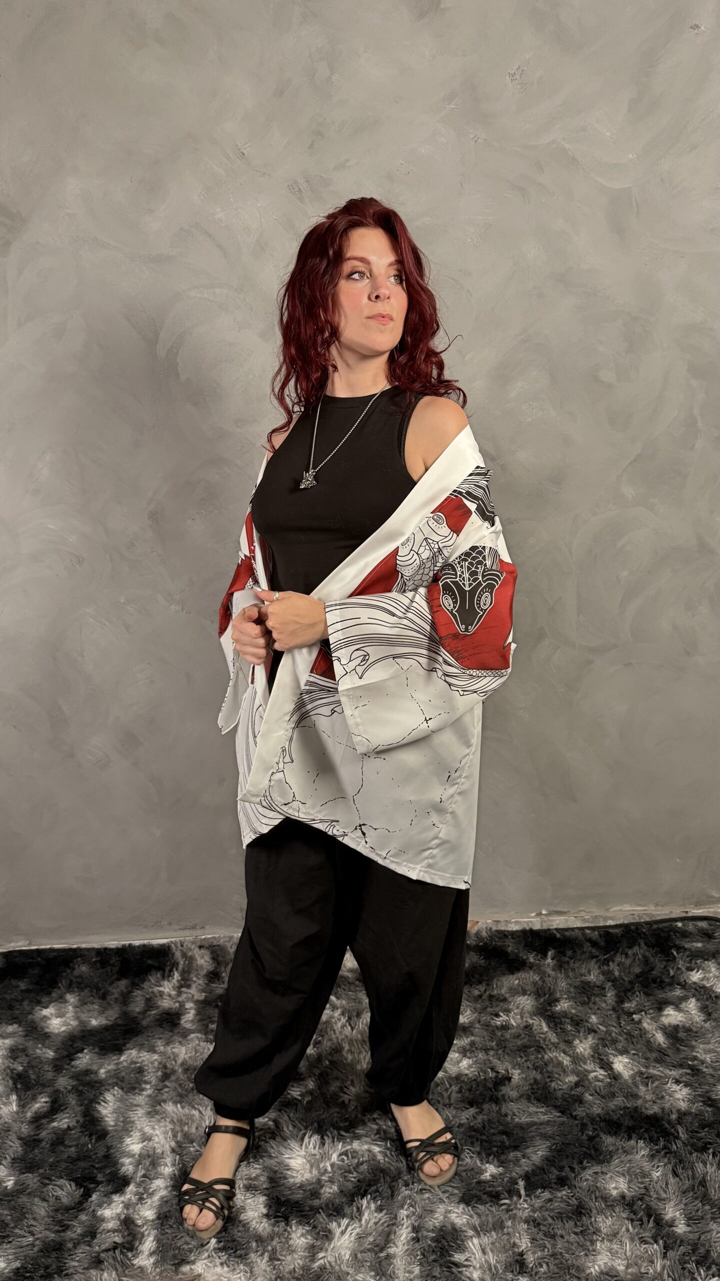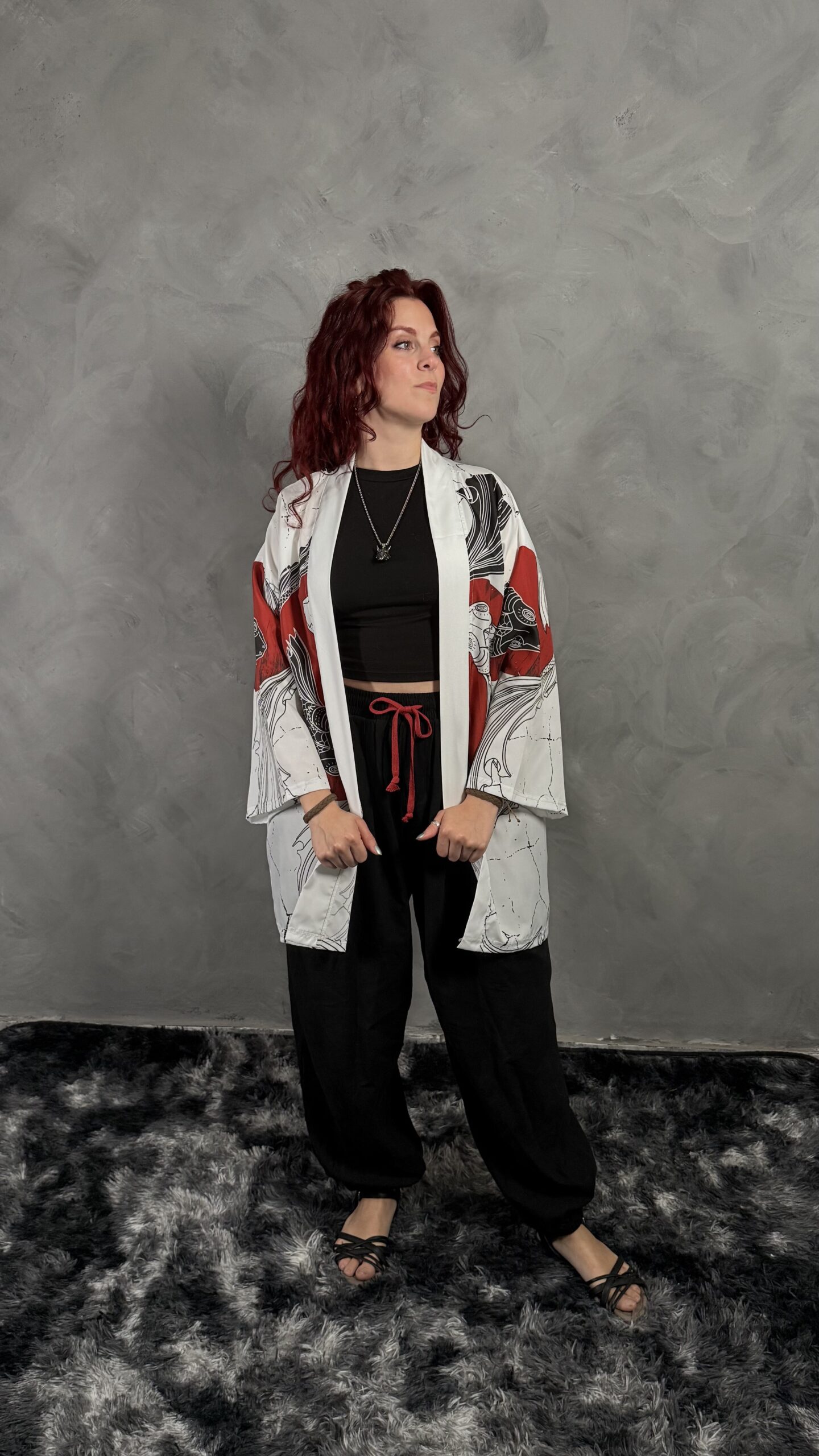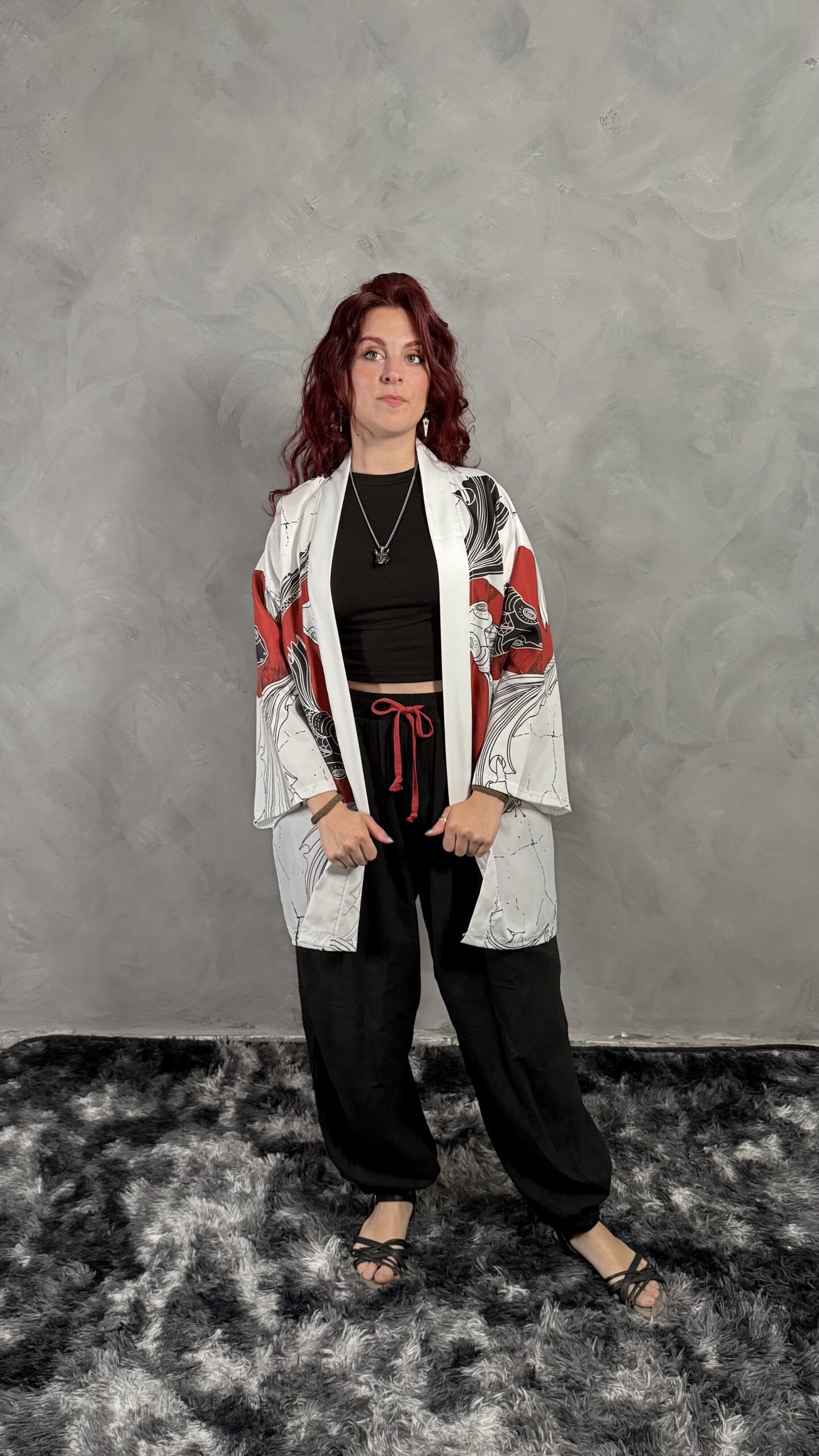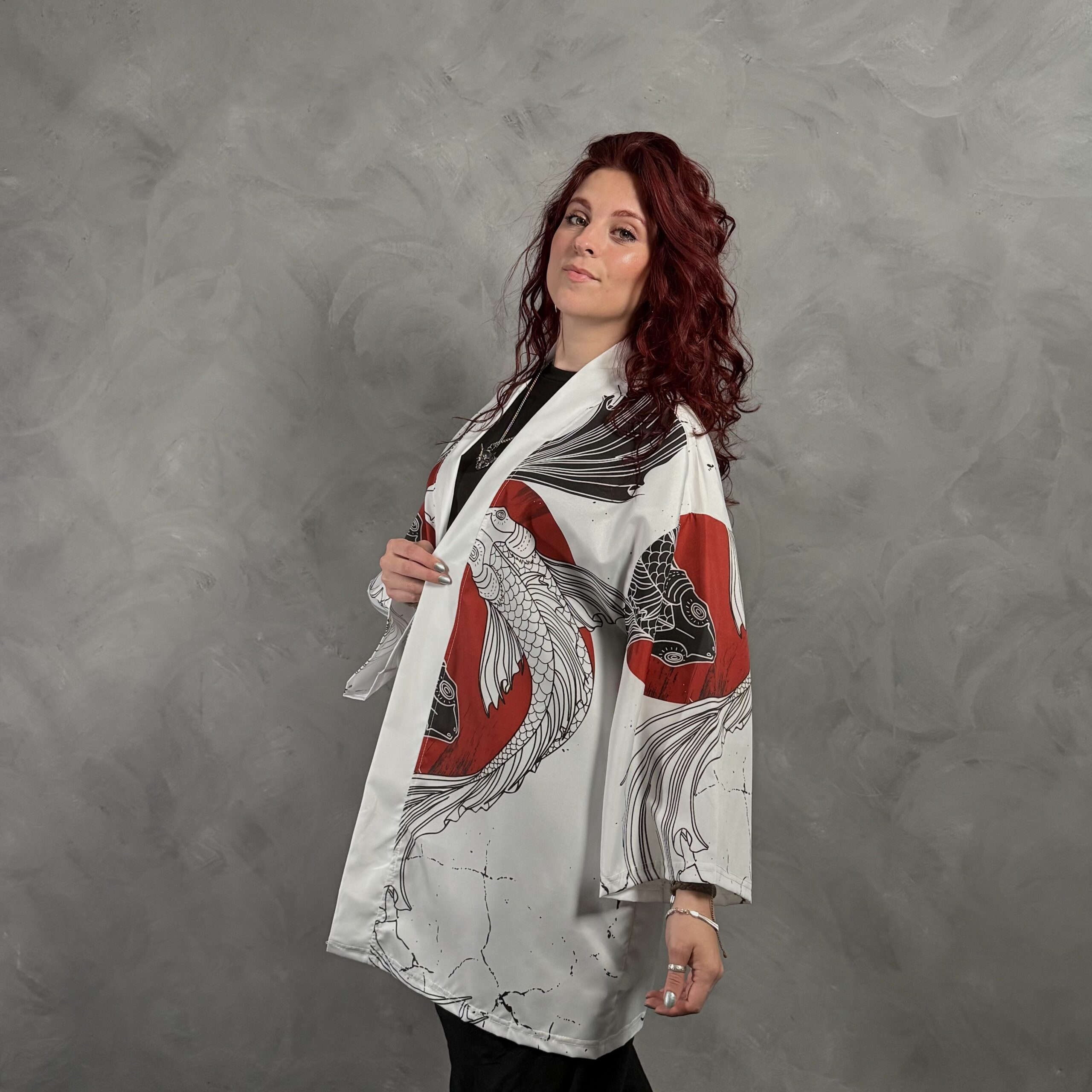 Haori blanco con diseño de carpas Koi en forma de Yin Yang y sol rojo. Representa armonía y dualidad. Tejido liviano y cómodo.