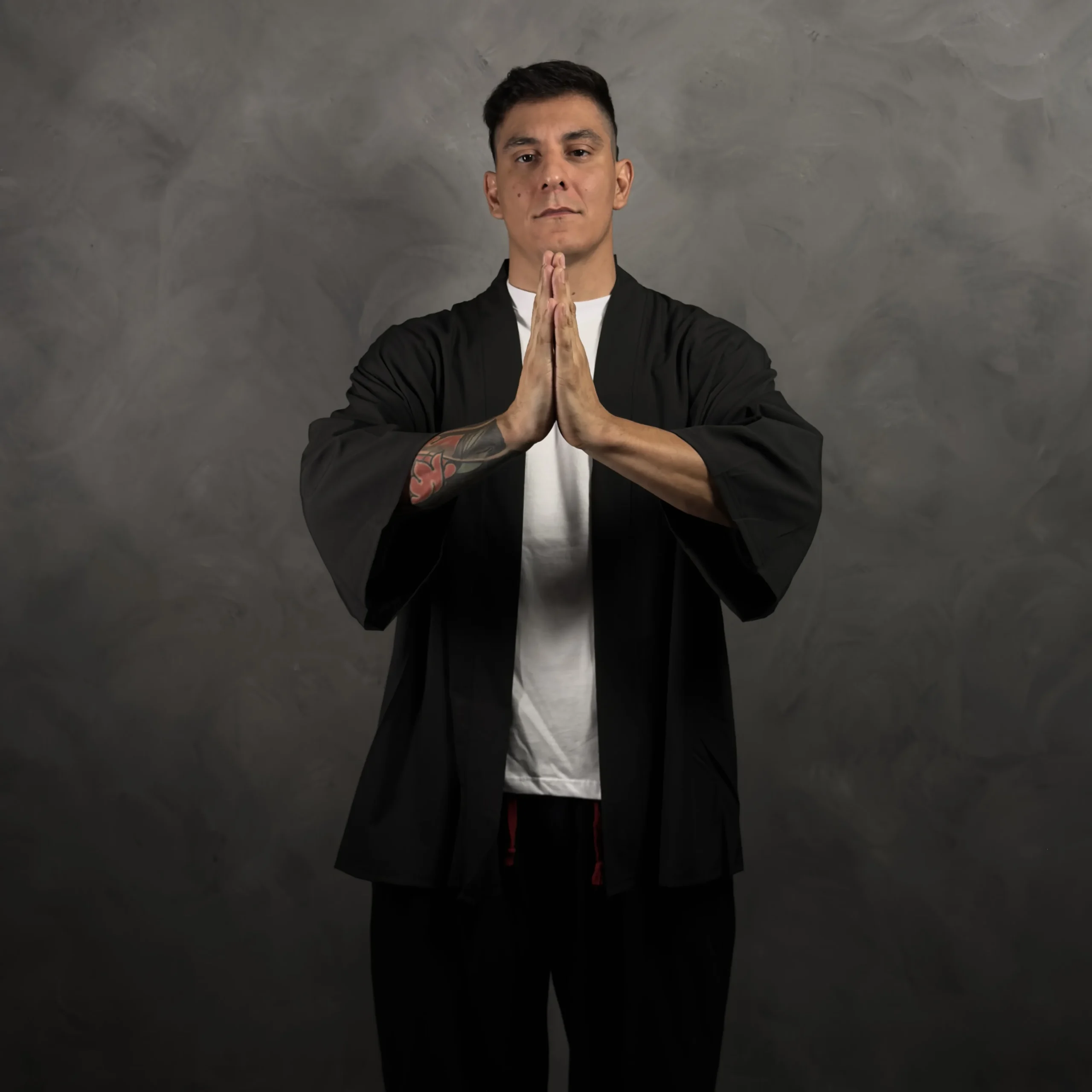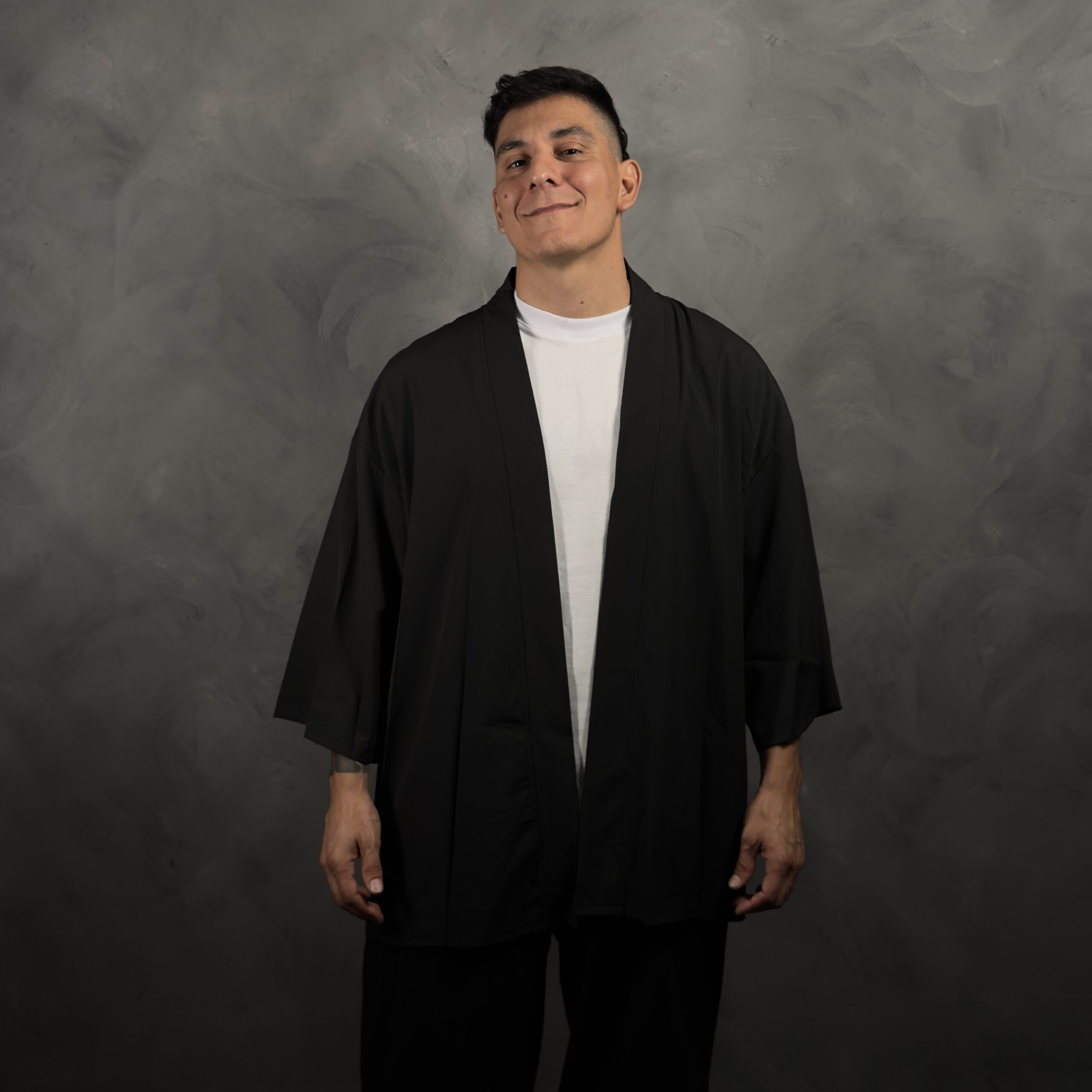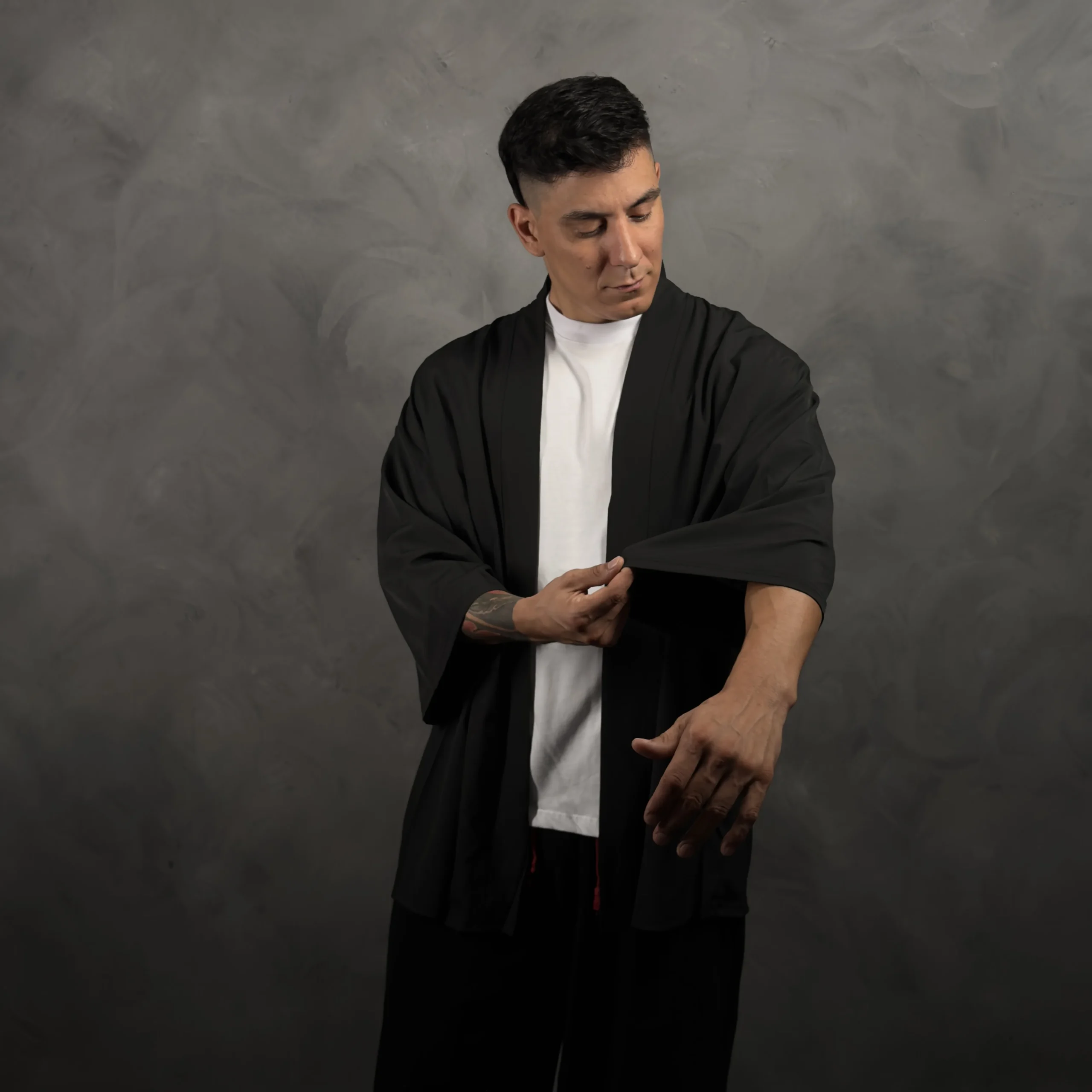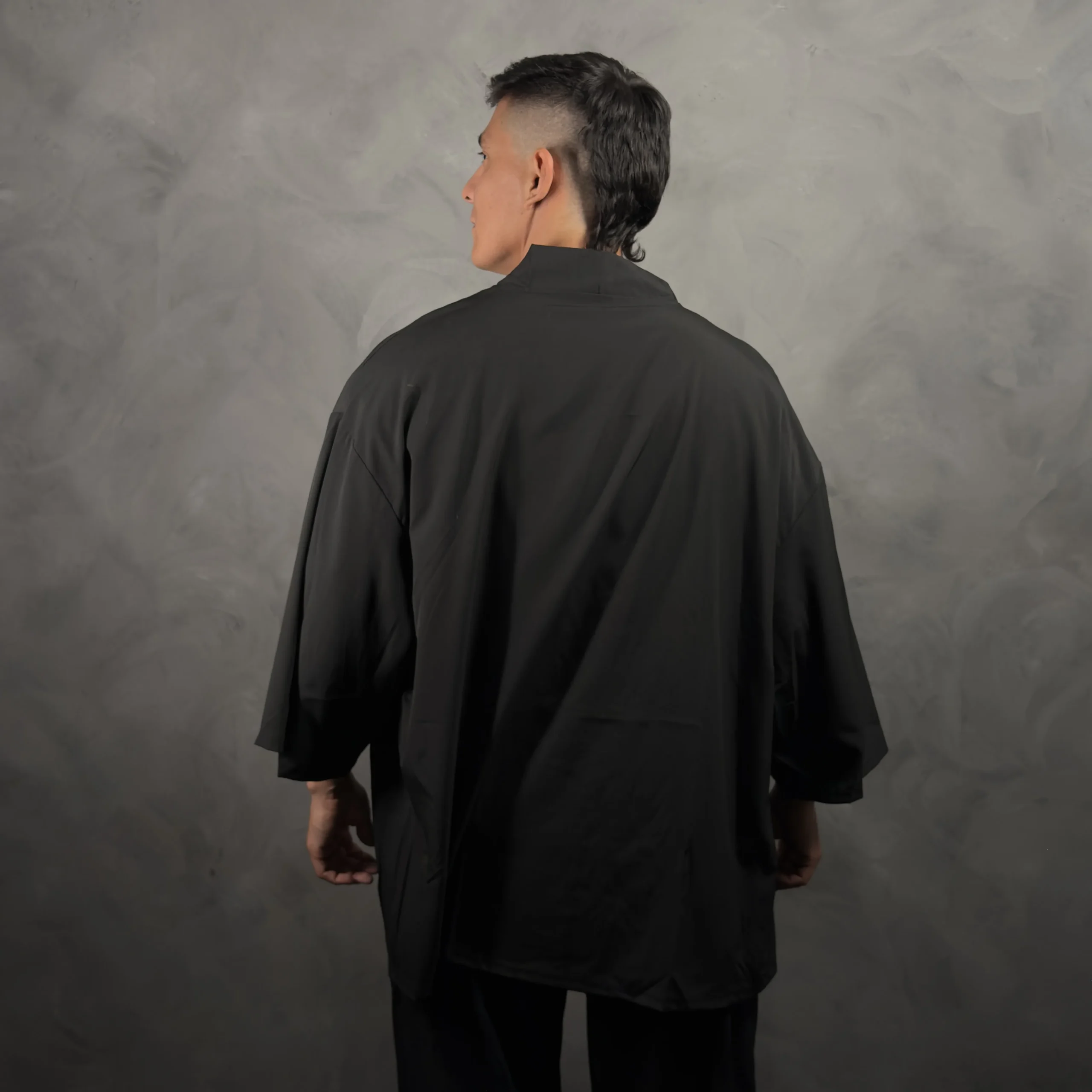 Haori negro liso, ideal para sumar una capa liviana a cualquier outfit. Tiene corte recto, mangas amplias 3/4 y cae a la altura de la cadera, perfecto para usar arriba de remeras básicas o camisas.