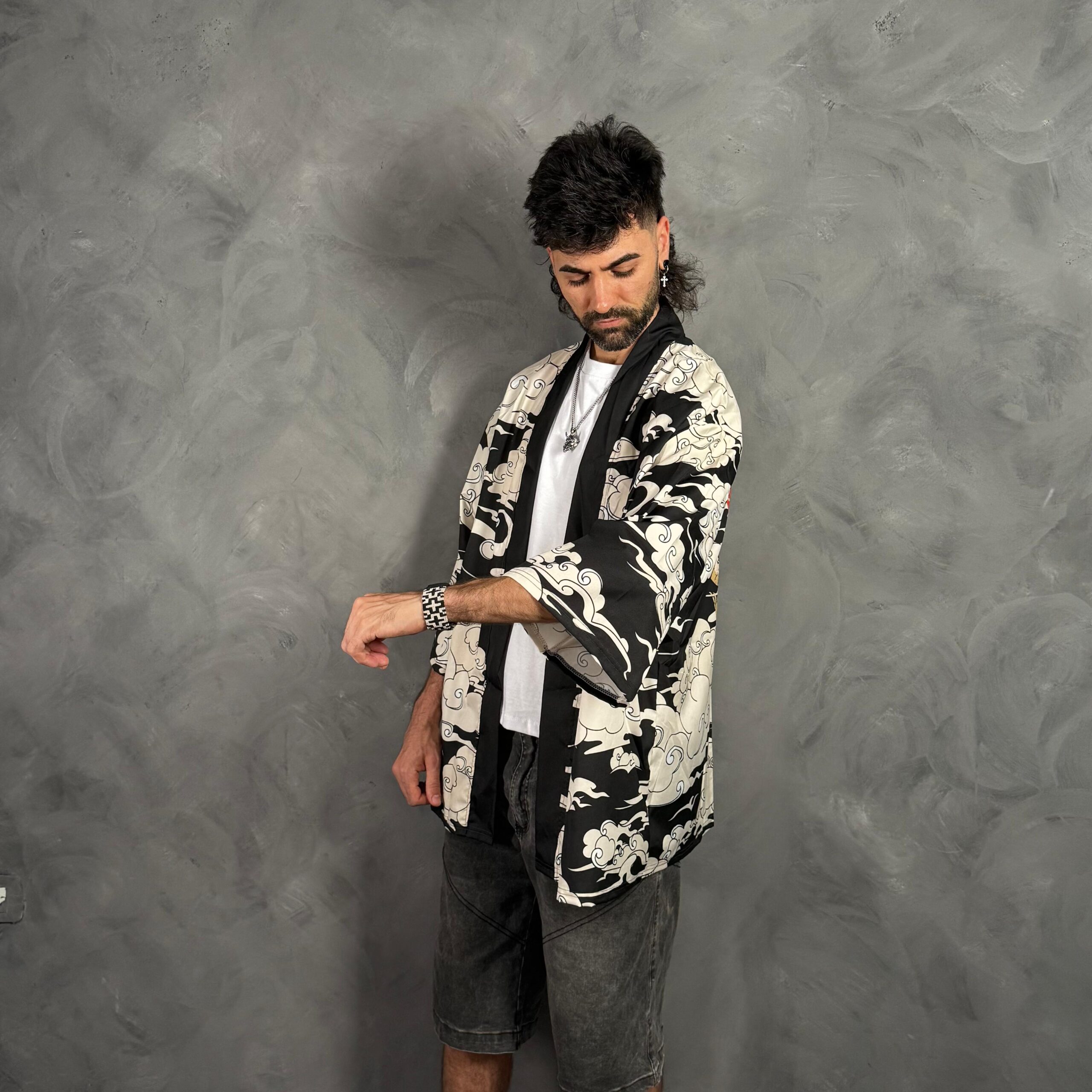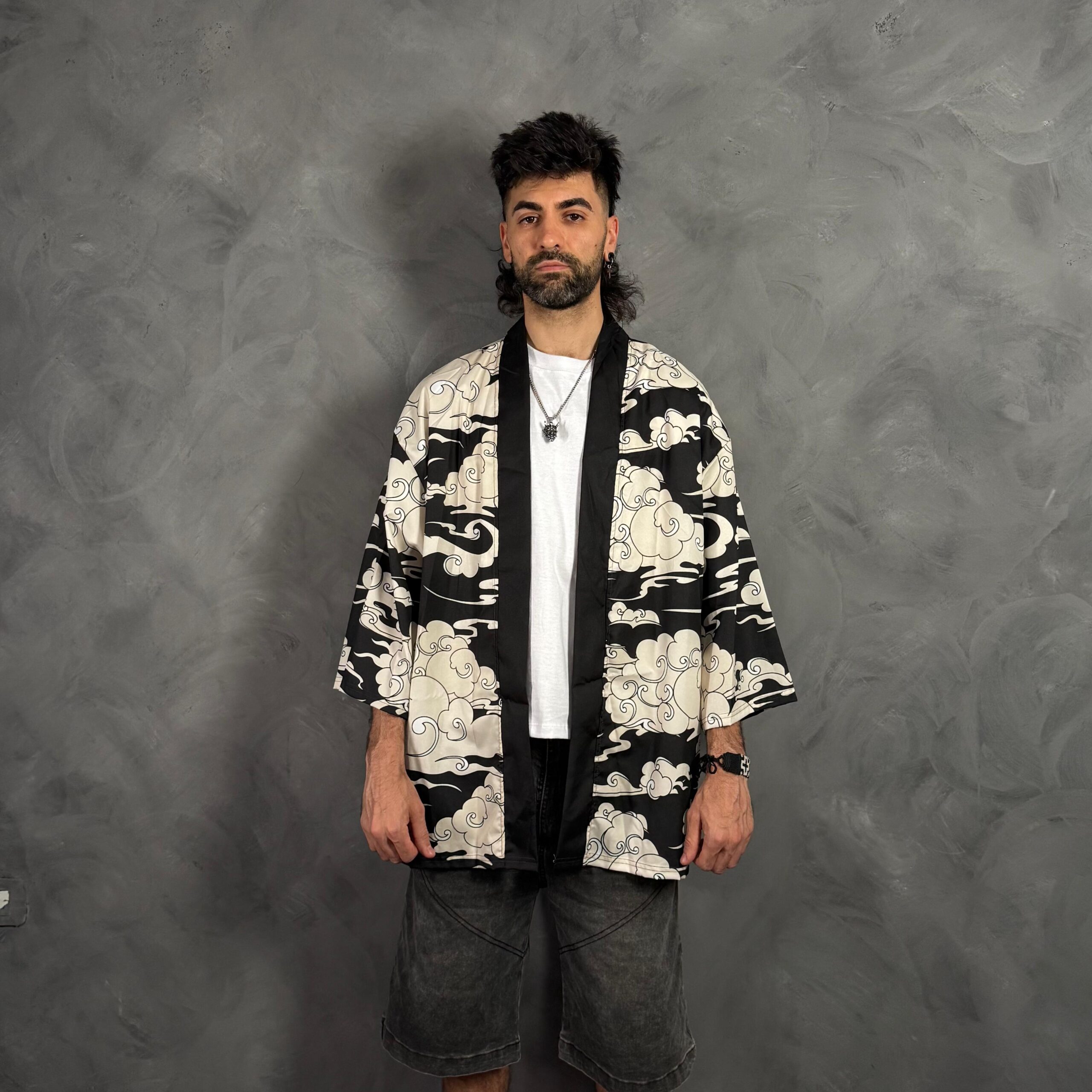 Haori oversize unisex en blanco y negro con estampa de nubes japonesas.