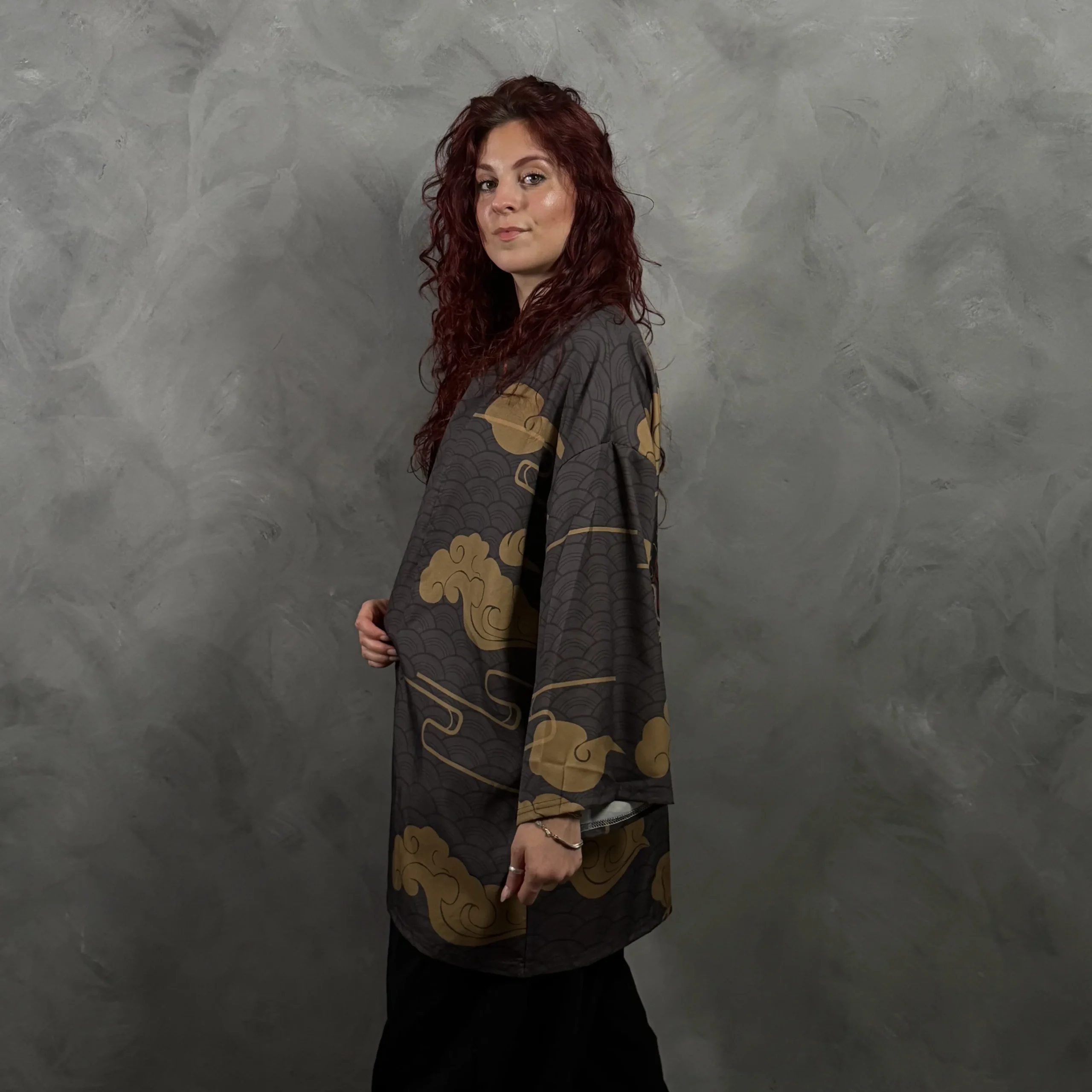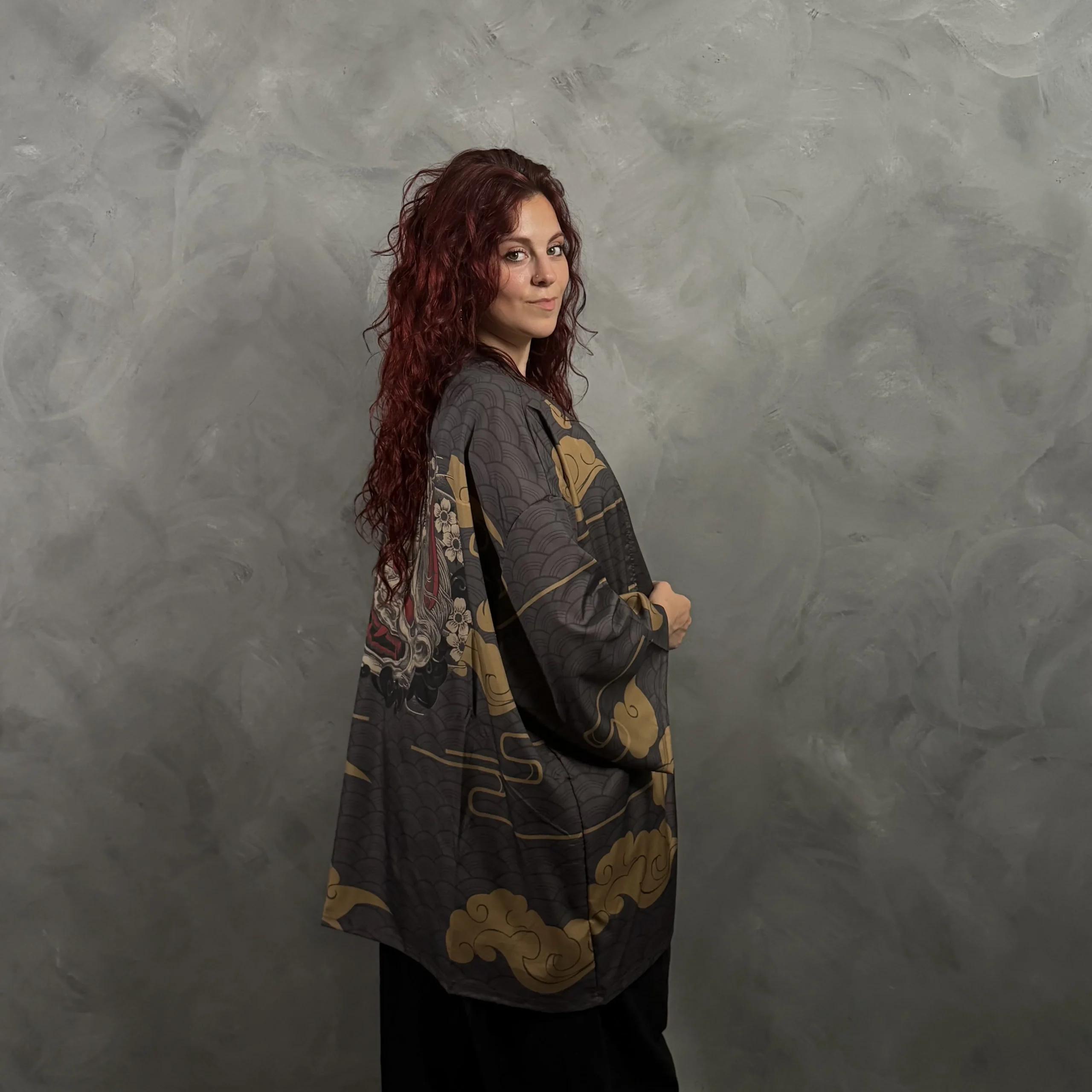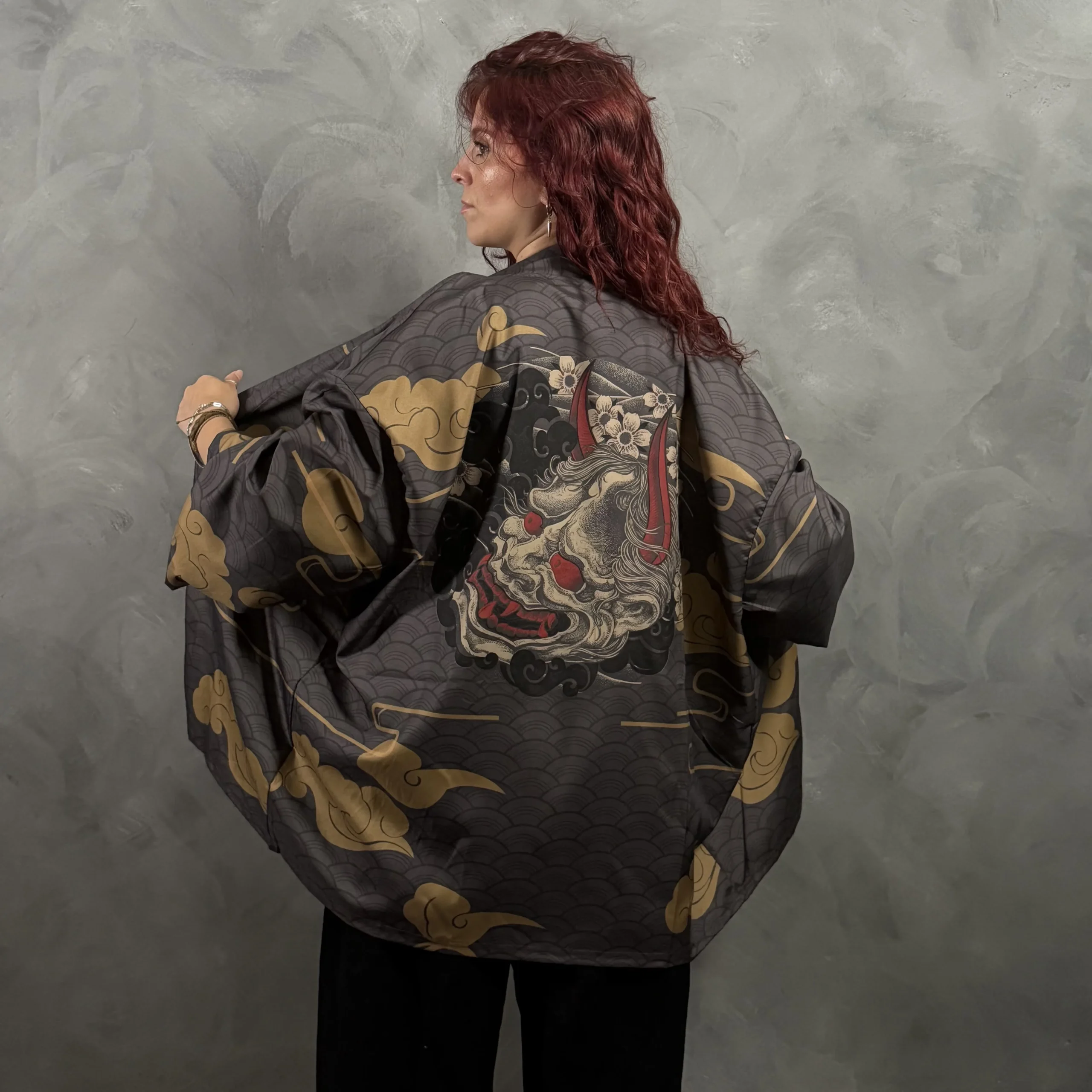 Haori oversize unisex en gris oscuro con nubes doradas y máscara oni en la espalda.