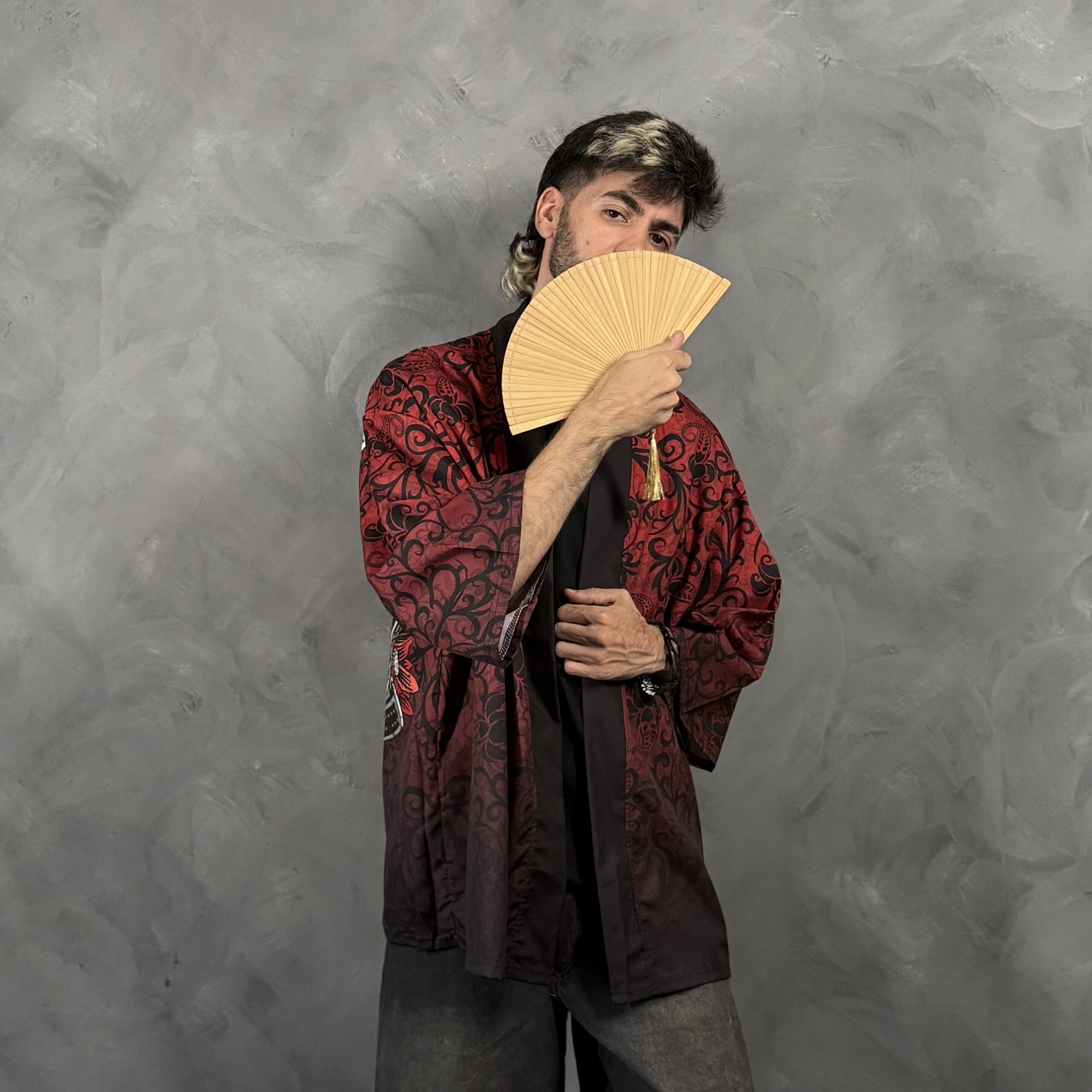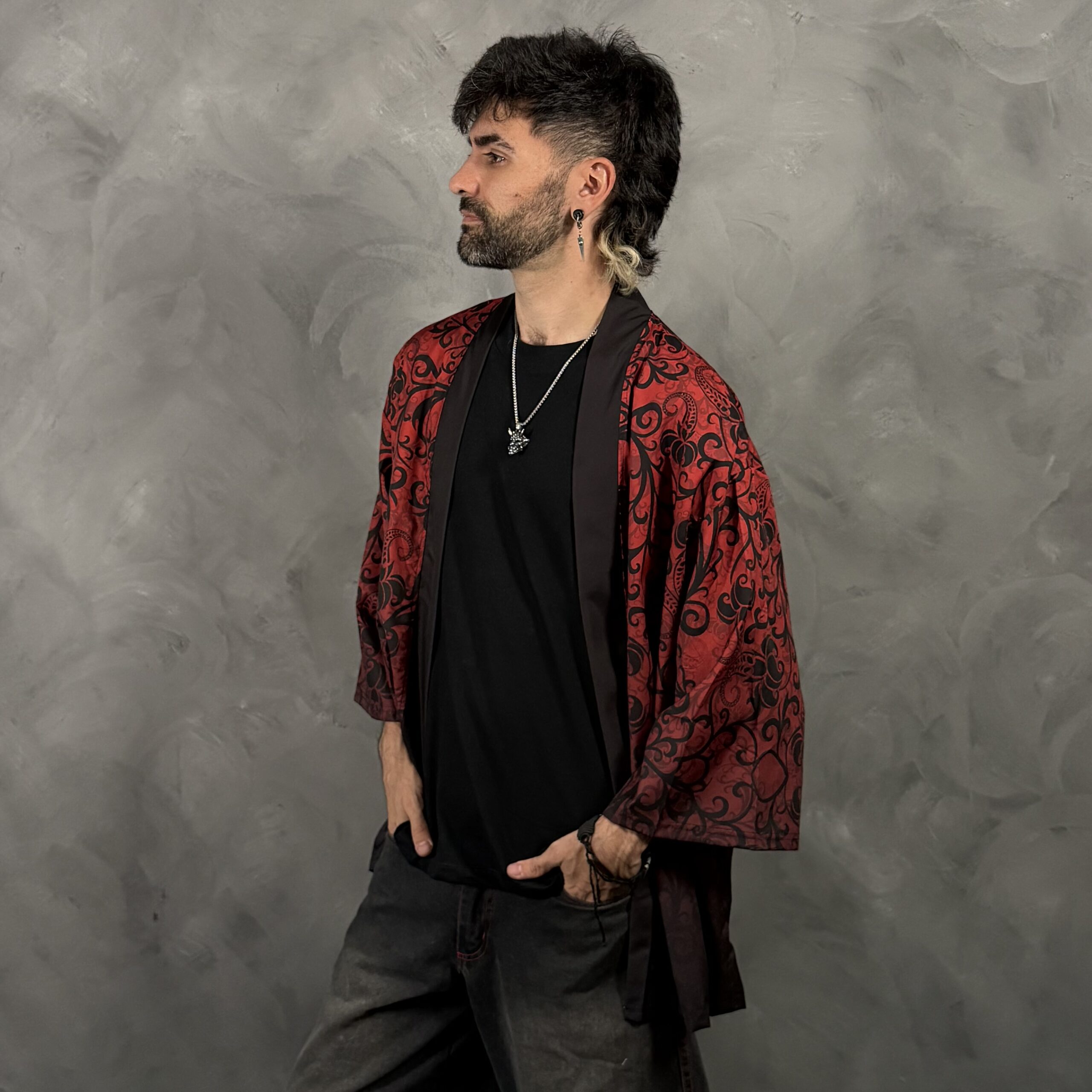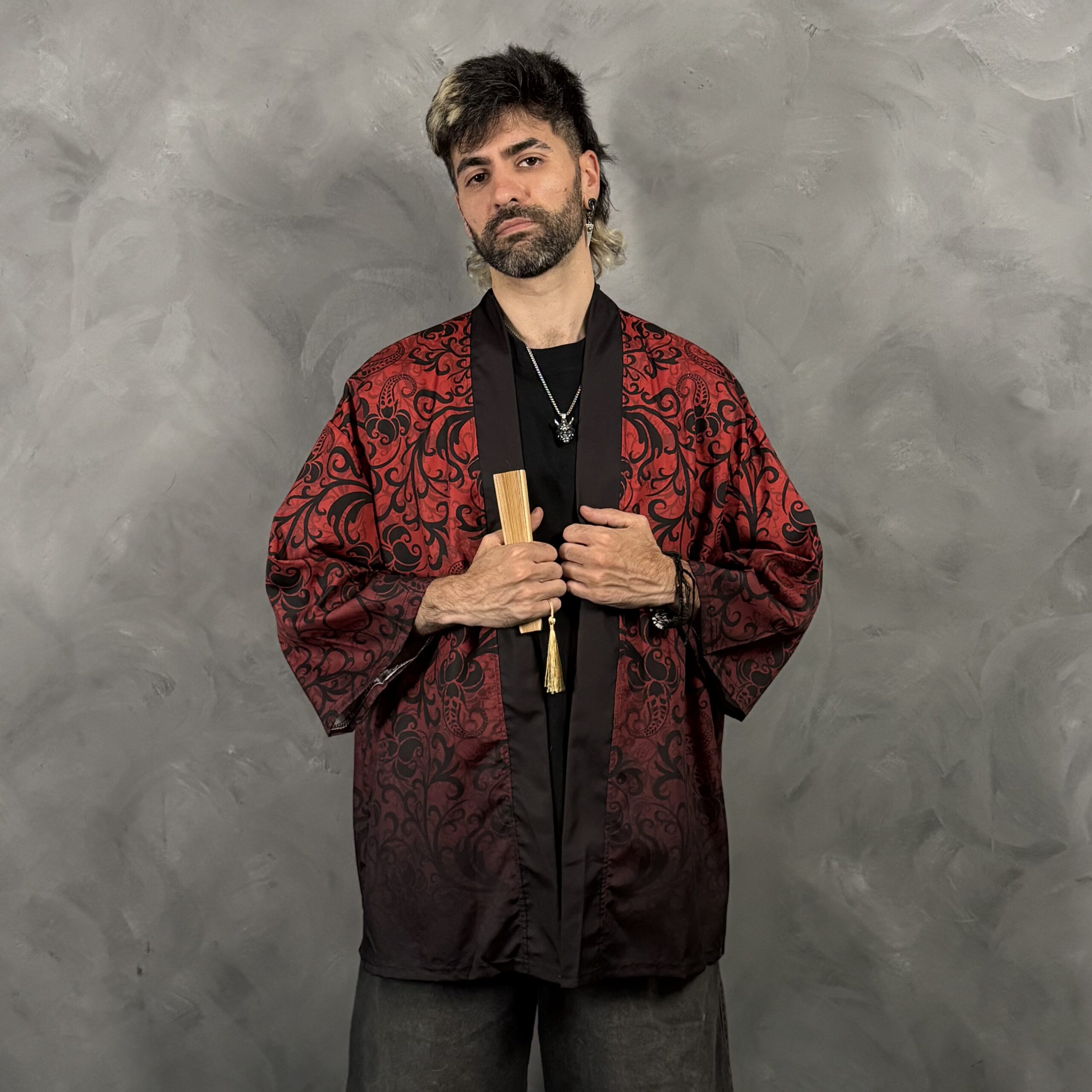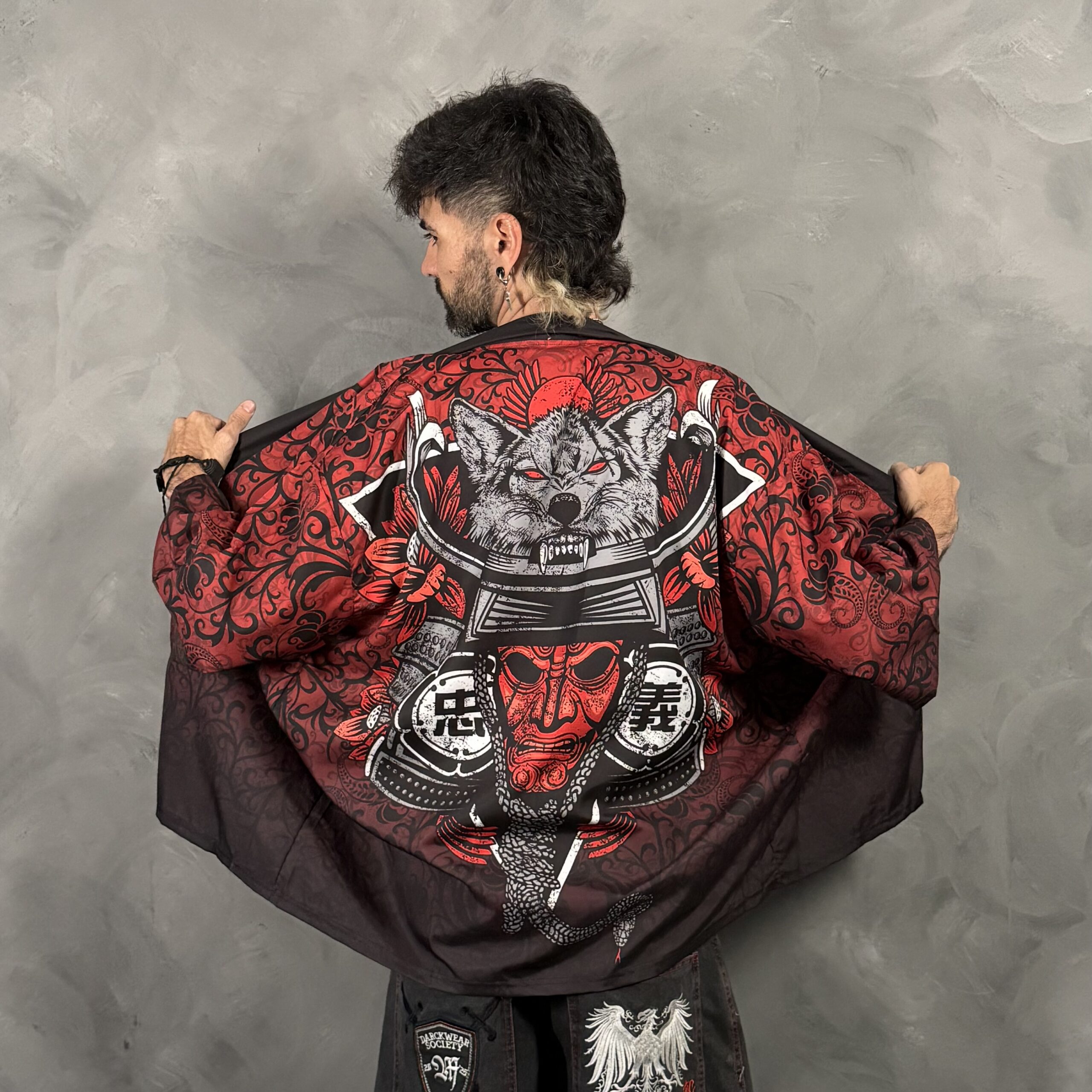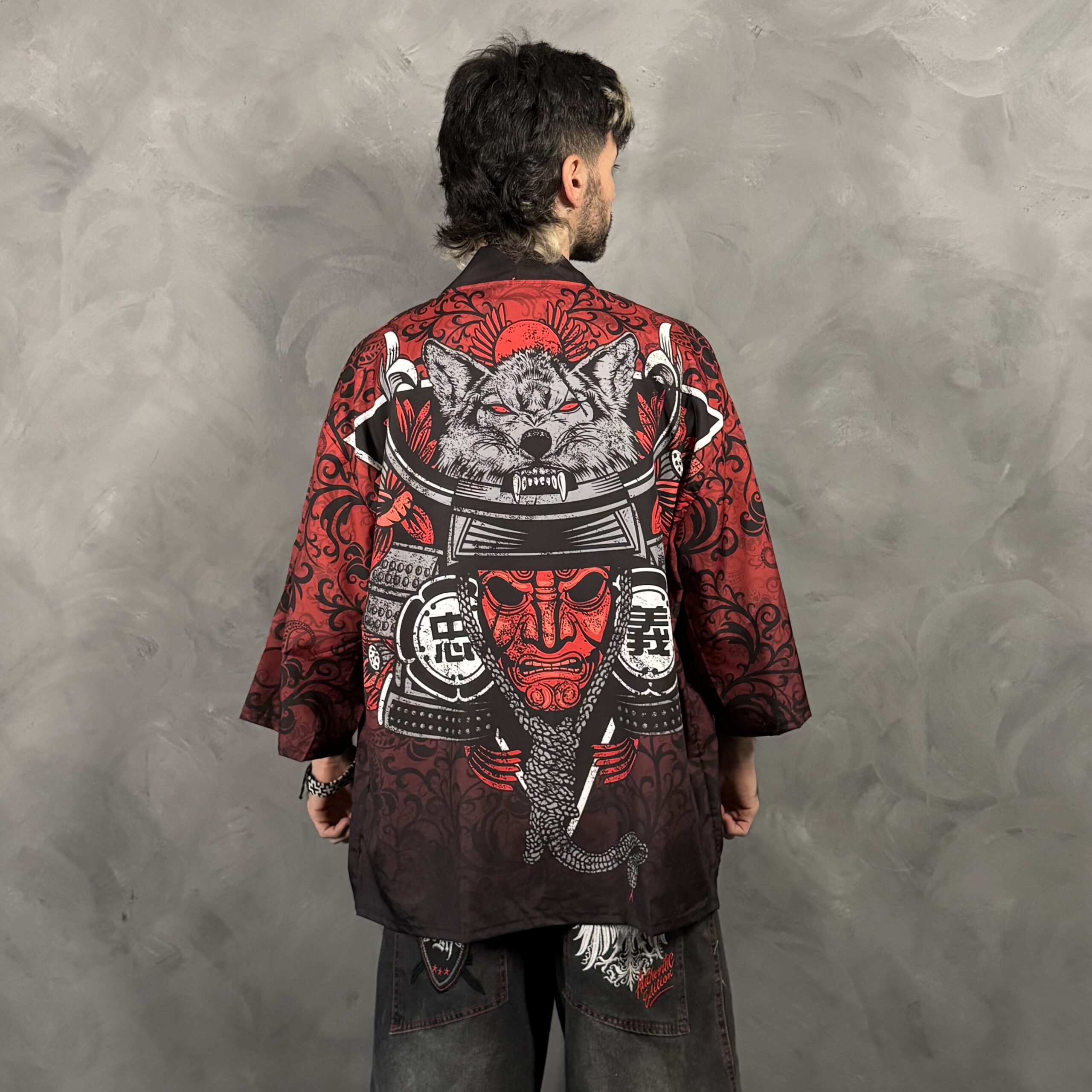Haori unisex de poliéster con corte relajado tipo kimono y mangas amplias. Diseño impactante en rojo y negro con máscara samurái y figura de lobo al dorso, ideal para outfits nocturnos y urbanos. Cuidado sugerido: lavado suave y secado a la sombra.