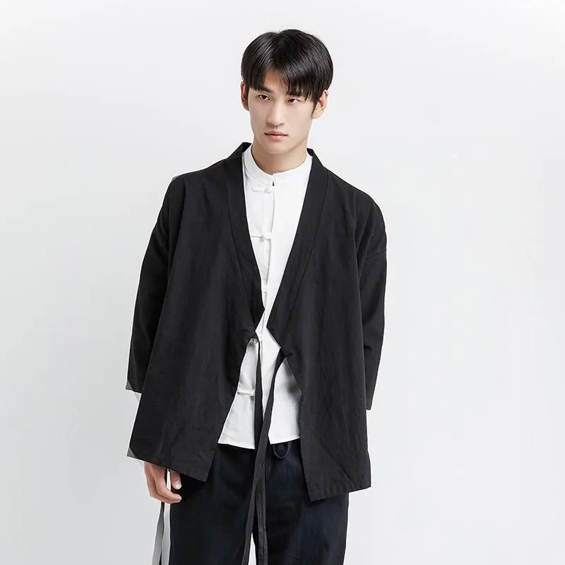 Haori de lino en negro, cruzado al frente con lazo lateral para ajustar a tu forma. Minimalista, cómodo y con caída limpia: queda perfecto para un look urbano sobrio o un outfit más elegante sin esfuerzo. Se puede usar cerrado tipo wrap o abierto como capa liviana.